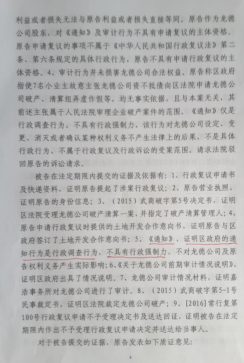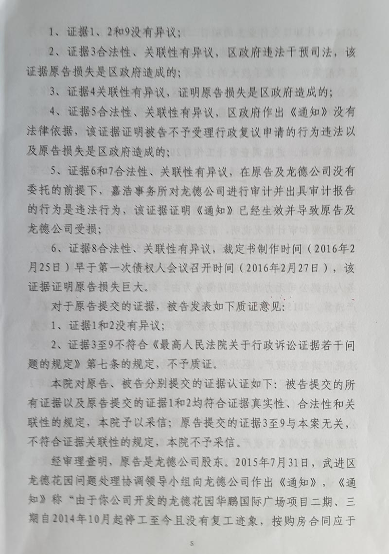 王和平表示:“我们对法院宣布龙德置业破产的程序存在质疑。龙德公司名下资产大于负债,远未到破产阶段,但在法院的操办下,龙德置业被认定为“资不抵债”而被宣判“破产”。2015年10月13日,6名购房人他们向法院提交申请,两周后的10月27日完成听证程序,而3天后,法院即裁定受理申请,并于当天指定破产管理人。4天之后的11月4日,破产管理人在法院的支持下,采取突然行动,强行控制了公司公章、执照等。2016年2月25日,法院裁定宣告破产。