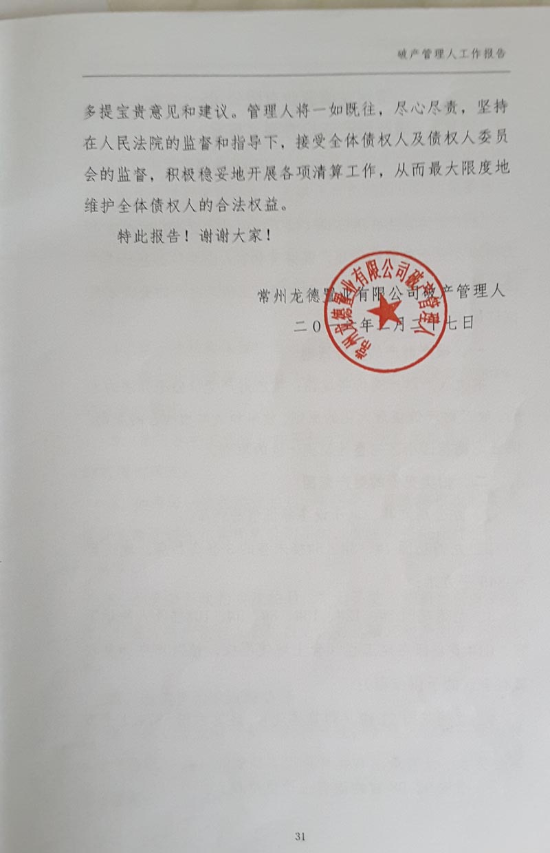 据2016年2月27日第一次债权人会议材料显示,截止武进区人民法院2015年10月30日受理日,龙德置业账面还有可处分资产245,739,982.14元。在管理人精心策划计算下,把正在江苏高院审理未果海天公司诉求判令1.2亿争议标的越权确定为6800余万元;把出现严重质量事故的在建工程,未经合法结算的工程款认定为1.3亿余元;把尚未确定保证责任的不确定的债权认定为637,454,944.15元到期债权,最终实现债大于资68,375,118.37元。如果管理人不把这些不确定之债进行虚报,龙德置业怎么也达不到“资不抵债”状况!账面上仍然存在245,739,982.14元。以上账务不吻合的客观事实足以证实,本案管理人存在虚报破产债务,故意导致龙德置业破产。这种问题应当如定性,可能还要继续通过研讨咨询方式寻求救济途径,被害人是否有权向公安机关报案。