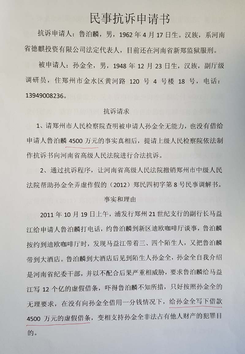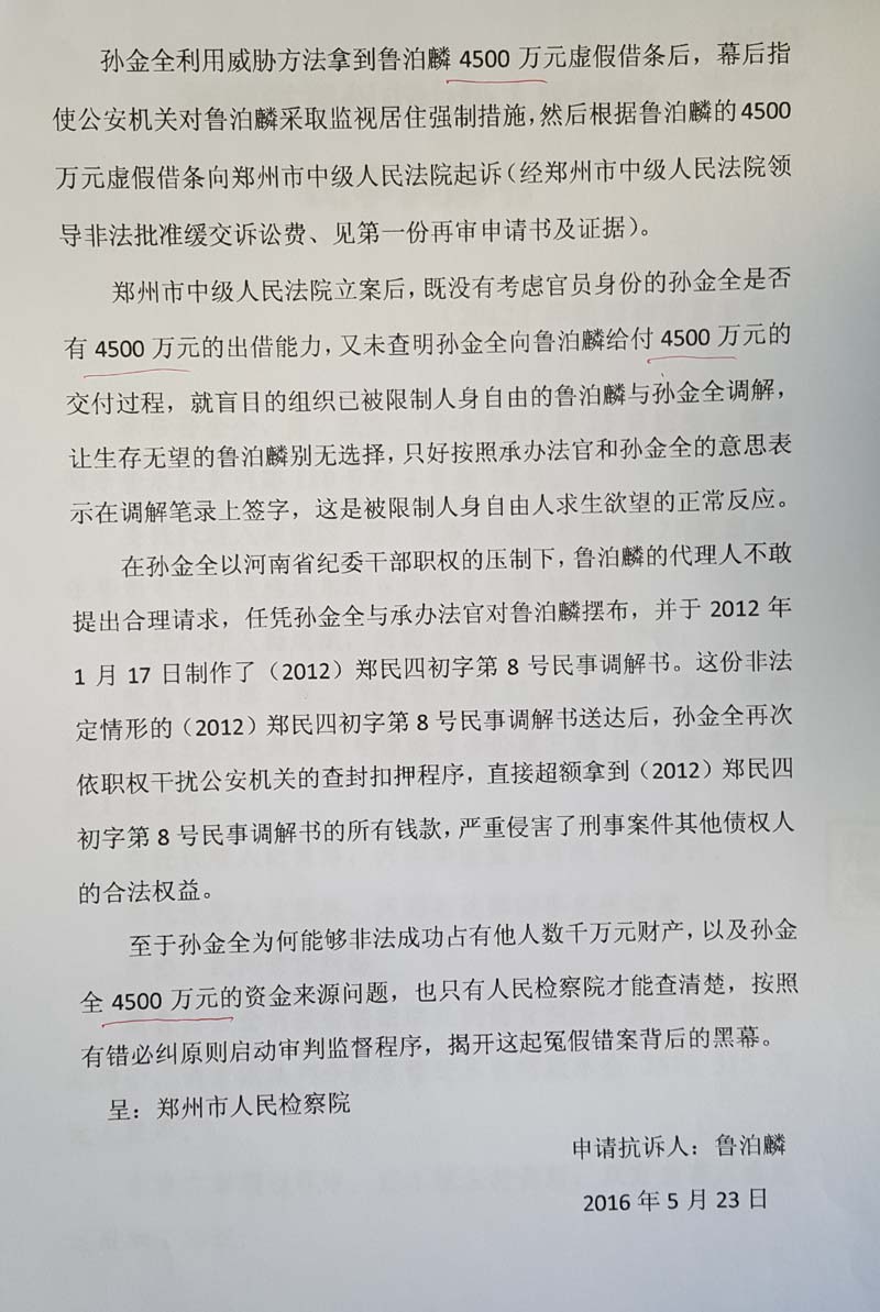 和鲁泊鳞再审申请书了解到。原告孙金全是河南省纪委的工作人员(现已退休),诉称