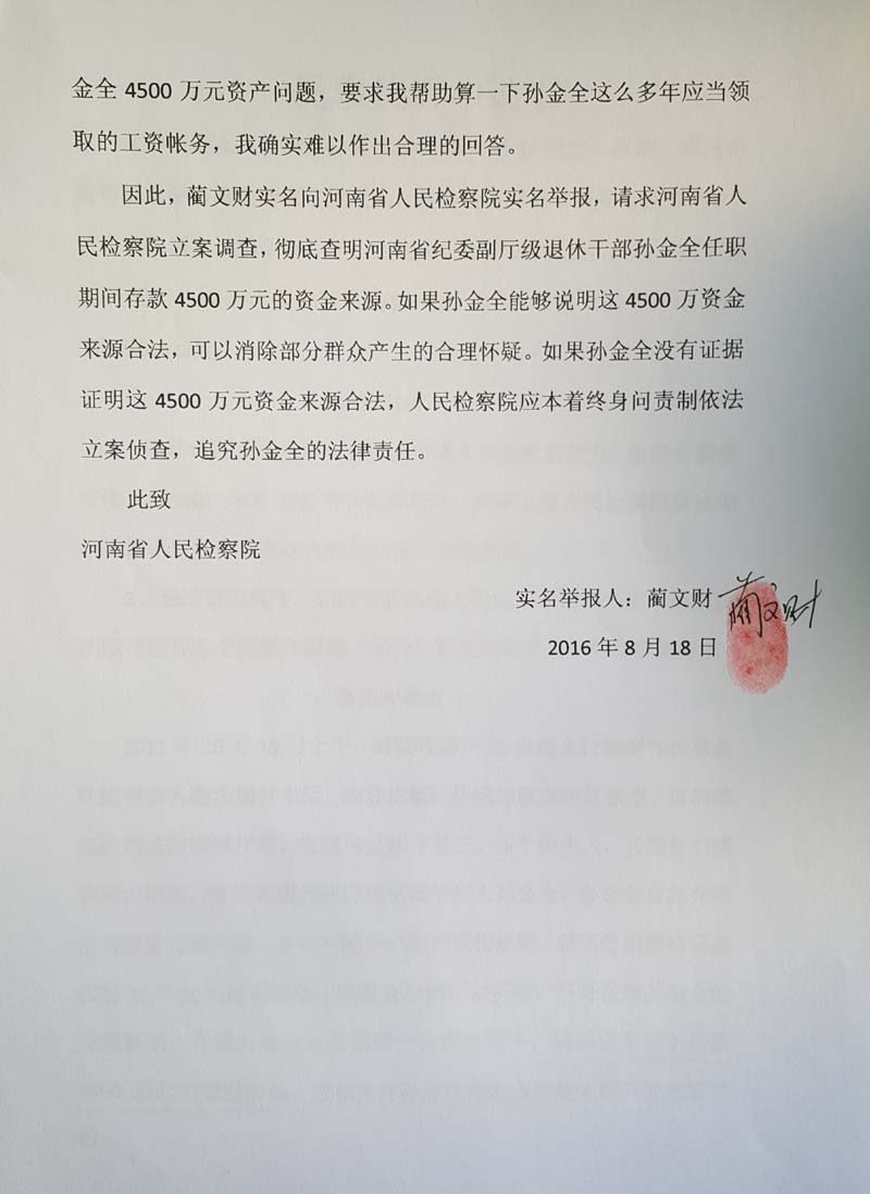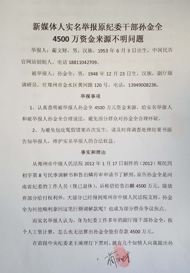 1、认真查明被举报人孙金全4500万元资金来源,给实名举报人和被举报人孙金全合
