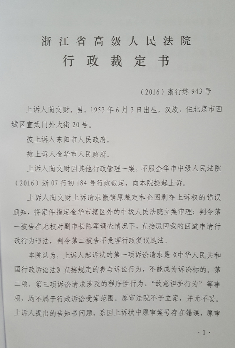 2、严格按照最高人民法院立案登记制度的规定,撤销浙江省高级人民法院有案不立的(2015)浙行受终字第225号行政裁定和金华市中级人民法院有案不立的(2015)浙金行受初字第65号行政裁定。