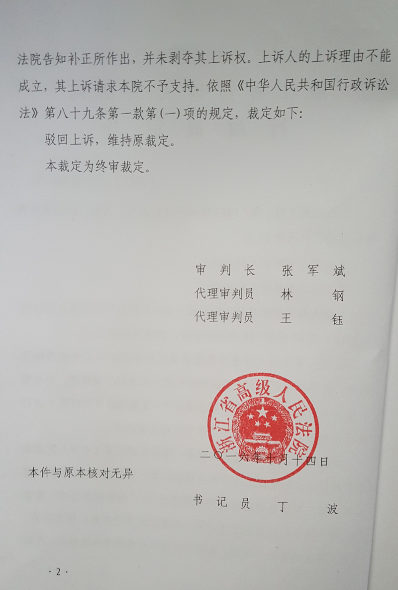 本色控股集团有限公司不服让群众难以信服的金华市中级人民法院的不予受理裁定,立即向浙江省高级人民法院提出上诉。浙江省高级人民法院审查10个月之久,认为金华市中级人民法院认定“未直接对本色控股集团有限公司产生影响”有误,在应当依法撤销纠正而不撤销纠正的情况下,再次编造虚假理由,谎称“并未改变上诉人的权利义务状态”。 如果法院用“未直接对本色控股集团有限公司产生影响”和“并未改变上诉人的权利义务状态”方法审查立案,利害关系人根本无权提起行政诉讼,可以把95%以上的行政诉讼案件拒之门外,导致我国《行政诉讼法》成为无用的摆设。