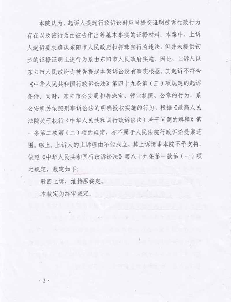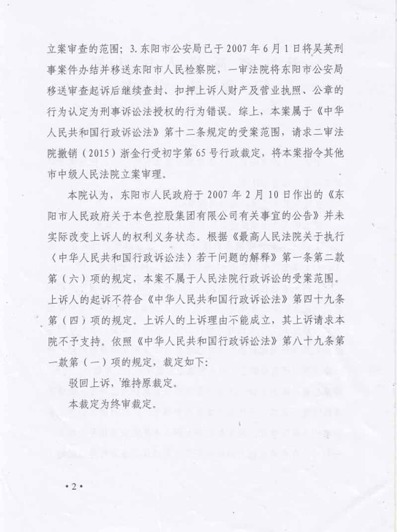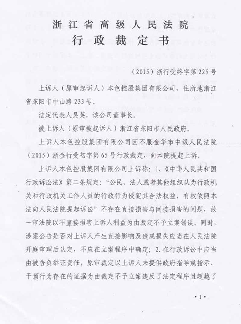 本色控股集团有限公司认为东阳市人民政府《东阳市人民政府关于本色控股集团有限公司有关事宜的公告》的具体行政行为侵害其合法权益后,多年不间断的向金华市中级人民法院提起行政诉讼,金华市中级人民法院以各种借口一拖再拖,多年后的2015年11月做出不予受理裁定,谎称《东阳市人民政府关于本色控股集团有限公司有关事宜的公告》未直接对本色控股集团有限公司产生影响,实在让人民群众难以理解和信服。