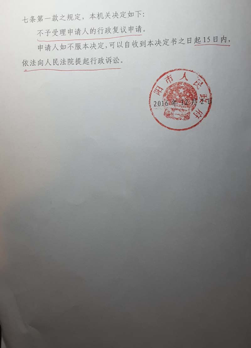 以对经东阳市人民政府作出行政复议决定的案件不予受理。