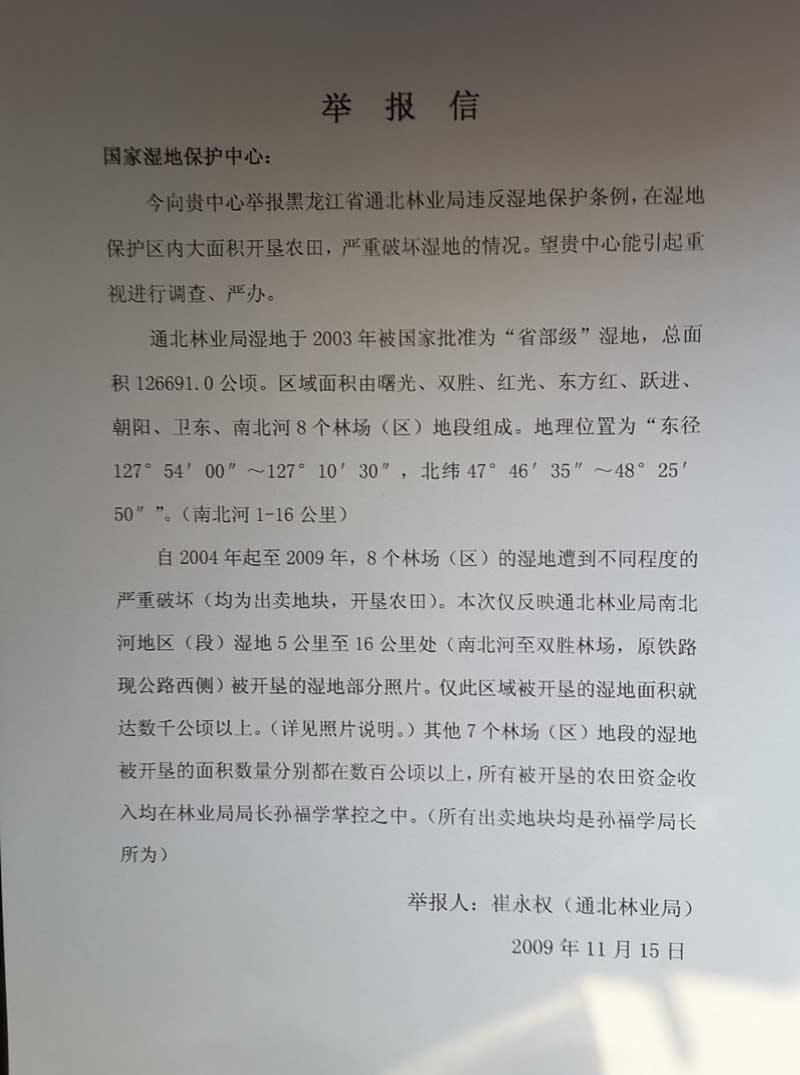 与此同时的2009年11月15日,崔永权向国家湿地保护中心举报“东