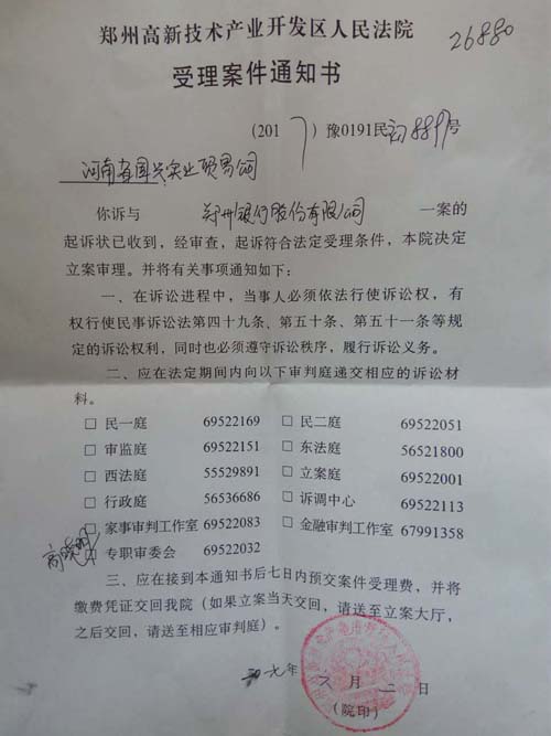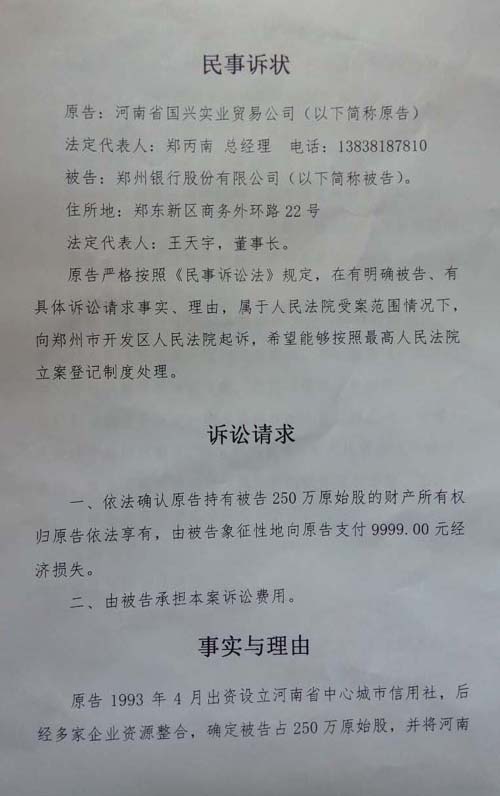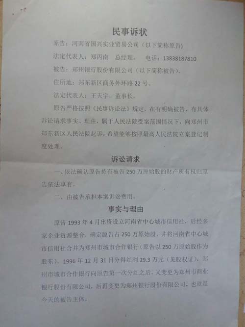 河南国兴公司起诉郑州银行股份有限公司确认股权归属,郑州市高新区人民法