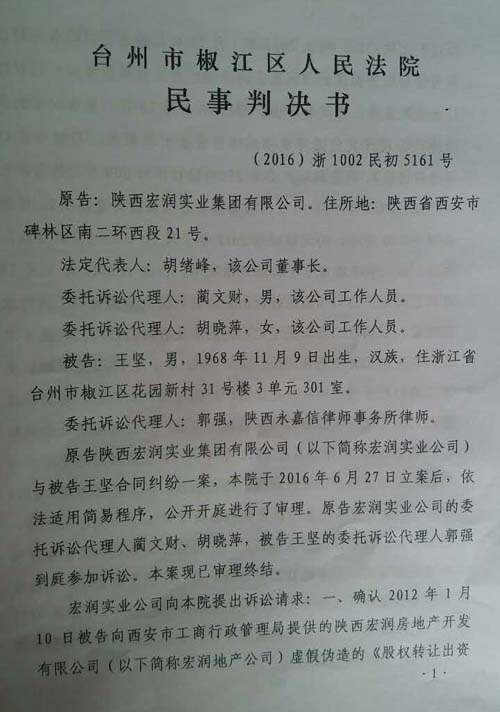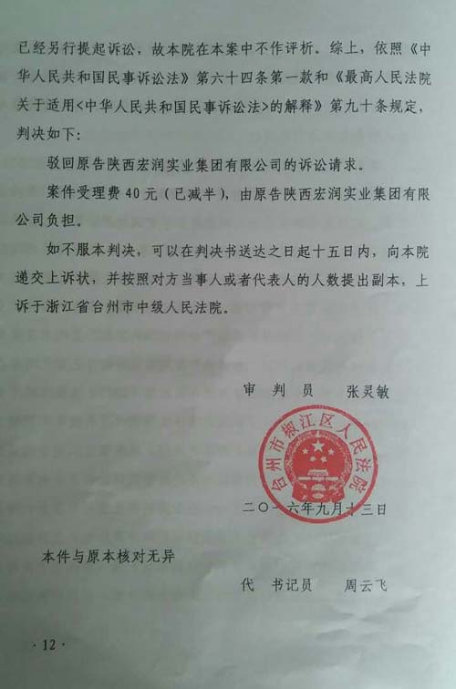 宏润集团起诉确认下边这份“股东转让出资协议”无效,椒江区人民法院向原告收取40元人民币。