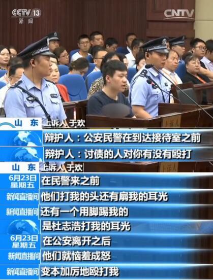上诉人 于欢:有。他们在民警到达前,打我头,扇我耳光,有一个人用脚踢我。是杜志浩打我耳光的。