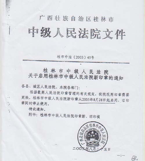 桂林市中级人民法院2003年8月25日公布封存未加壮文的旧印章,从28日开始启