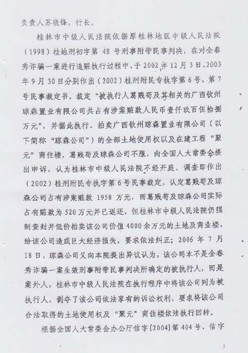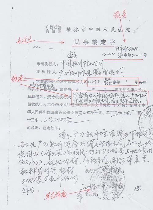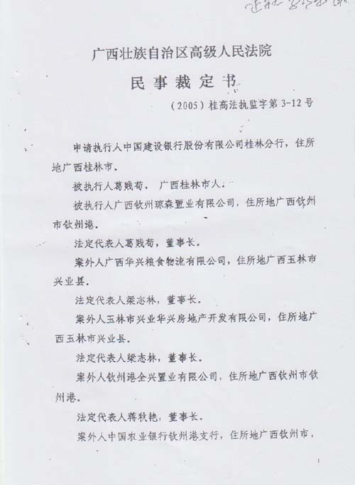 3、在腐败官员们的策划下,通过建行与有法不依的罗润民法官恶意窜通,罗润民按照建行申请伪造“(2002)桂市刑附民专执字第2-1号民事裁定书”,执行了申诉人加之上亿元的土地等财产,导致申诉人企业形成接近死亡状态,引发媒体和最高人民法院关注。