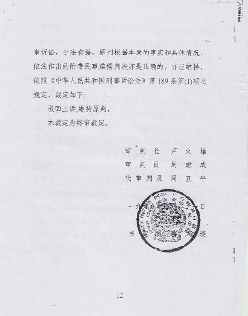 2、中院(1998)桂地刑初字第48号刑事附带民事判决,也没有判处申请人向被申请人支付巨额财产结论,否则罗润民法官也不会私自编造案号,更不会于2003年12月25日盗用中院2003年8月25日封存作废的公章(废公章无壮文、新公章有壮文)伪造裁定书。