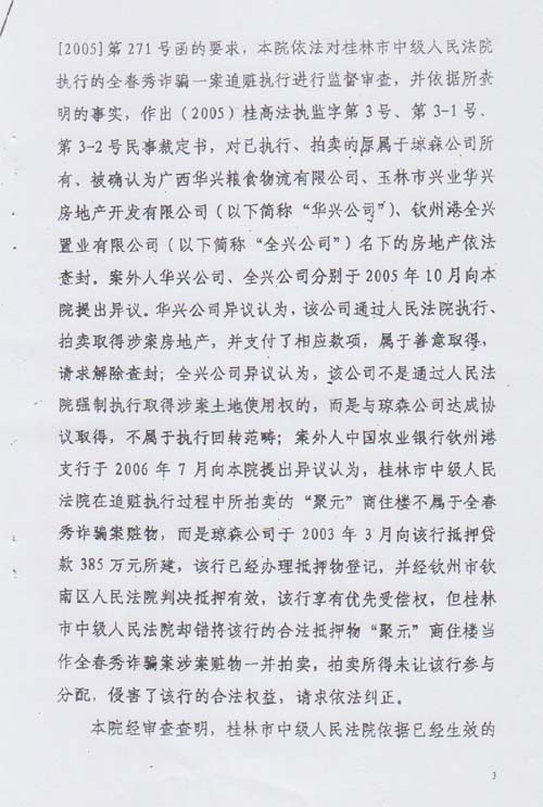 4、经全国人大监督,高院2007年6月14日做出桂高法执监字第3-12号民事裁定书,在不知罗润民法官2003年12月25日盗用中院2003年8月25日封存作废公章伪造“(2002)桂市刑附民专执字第2-1号民事裁定书”的情况下,仅撤销(2005)桂高法执监字第3号、第3-1号民事裁定书,建行违法申请强制执行、罗润民法官违法帮助强制执行的违法执行行为没有得到彻底解决。
