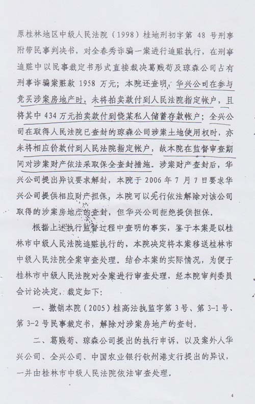 广西高院的这份裁定对229亩土地及7000多平方米商住楼解封,该地产最终被顺利过户至全兴置业、华兴公司、华兴地产三家公司名下。