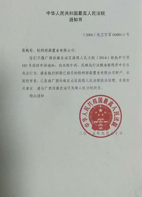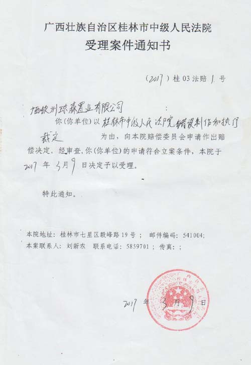 在最高人民法院2015年9月30日公正监督下,桂林市中级人民法院受理了司