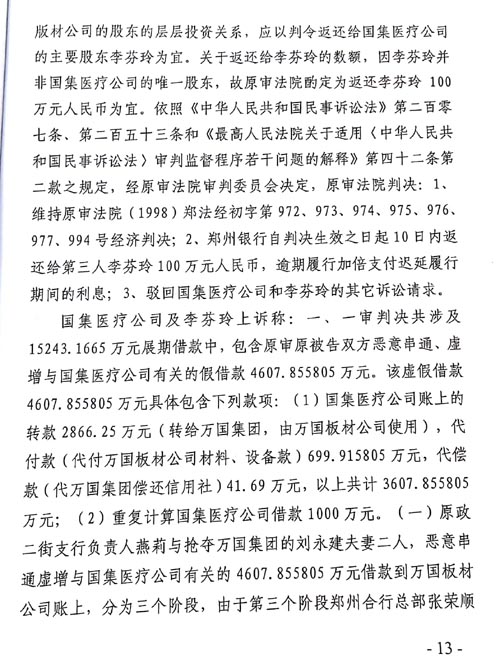 郑州市银行股份有限公司自判决生效之日起十日内返还给第三人李芬玲100万元人