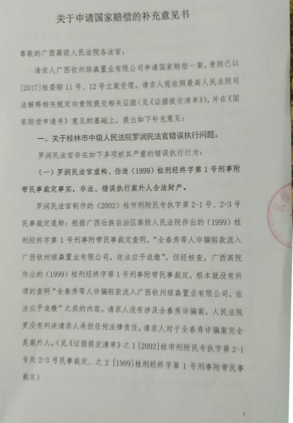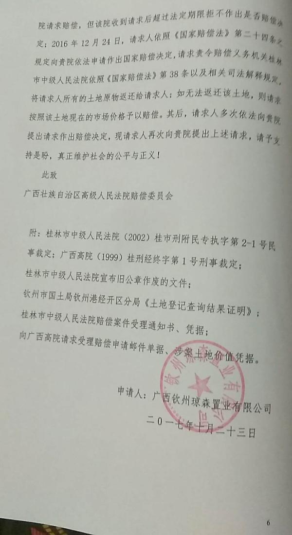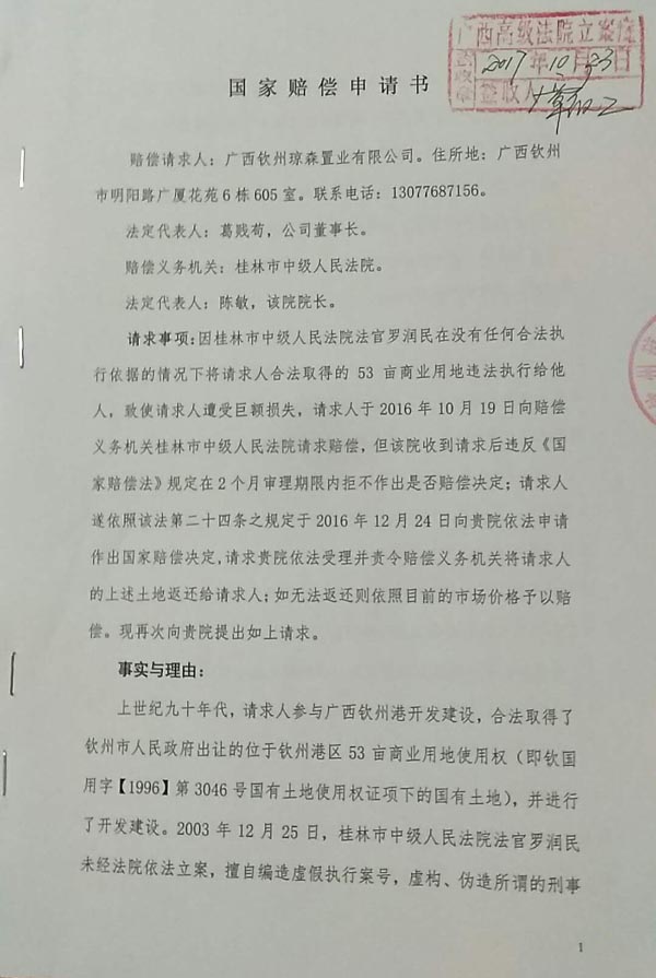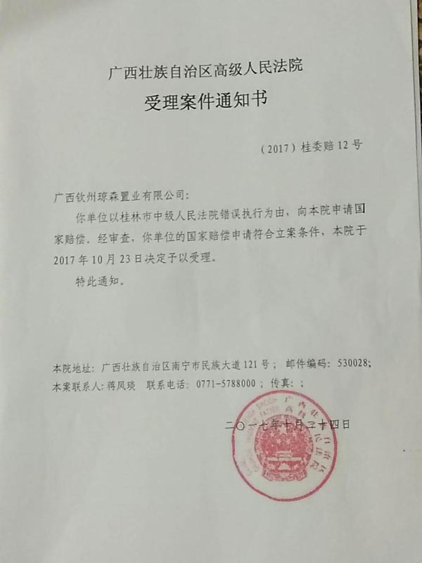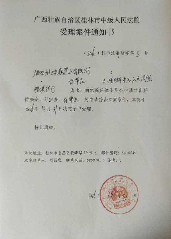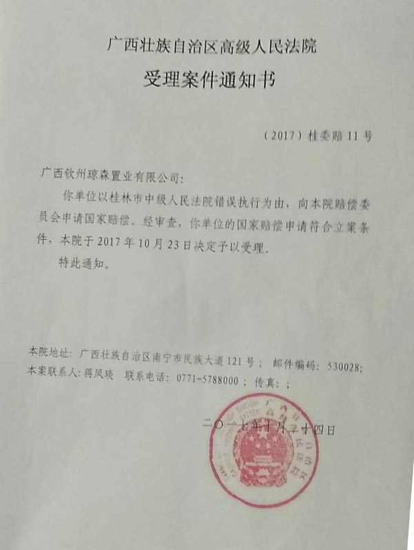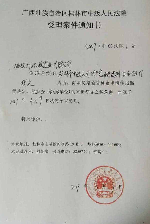 赔偿请求人广西钦州琼森置业有限公司2016年10月31日向人赔偿义务机关桂林市中级人民法院提出赔偿申请,桂林市中级人民法院认为符合受理条件,并于2016年10月31日决定受理(见【2016】桂市法赔字第5号案件受理通知书)。