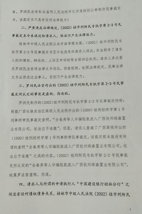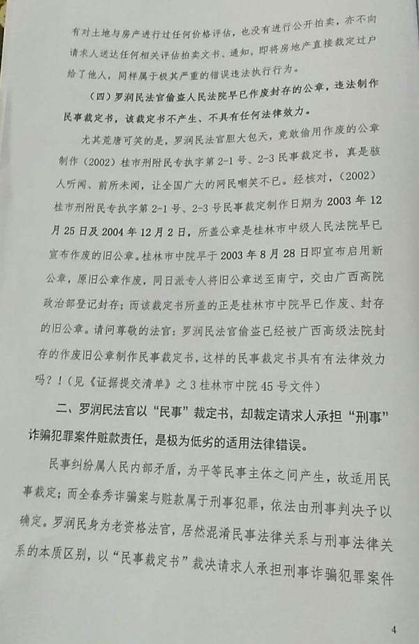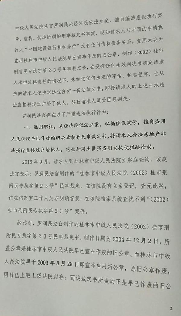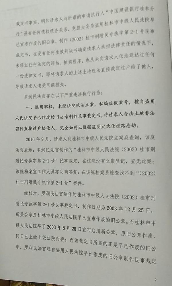 目无国家法律的被控告人罗润民法官之后,冒用桂林市中级人民法院名义接受,私自编制执行案件的号码(目前在档案室找不到这起案件号码),并于2003年12月25日,利用桂林市中级人民法院已经封存作废的公章,伪造法院“(2003)桂市刑附民专执字第2-1号民事裁定书等”,未经拍卖执行程序,就将控告人具有合法使用权的共200多亩土地交给关系户(至今法院和建行无收款记录)。申请人建行和桂林市中级人民法院从未收到一分执行款,简直让所有控告人难以相信有这么胆大妄为,最高人民法院领导也高度重视,并于2015年向控告人下发书面通知,要求广西自治区高级人民法院监督纠正,但至今没有纠正结果,犯罪嫌疑人罗润民法官仍然在职、逍遥法外。