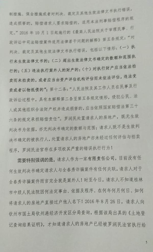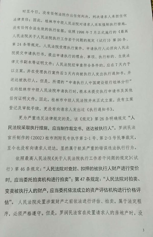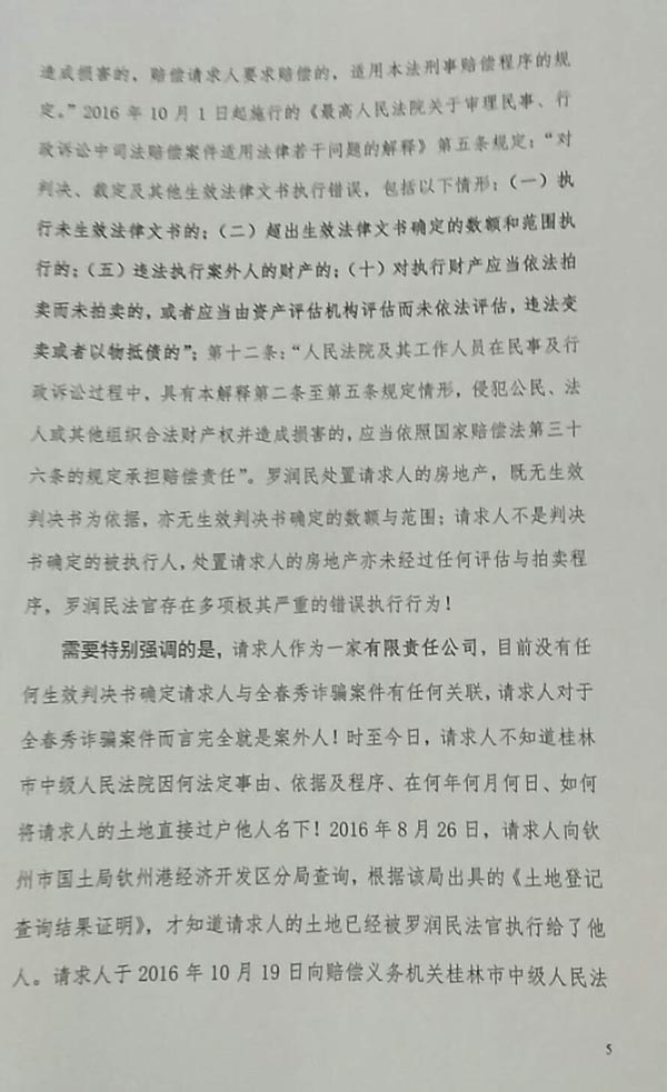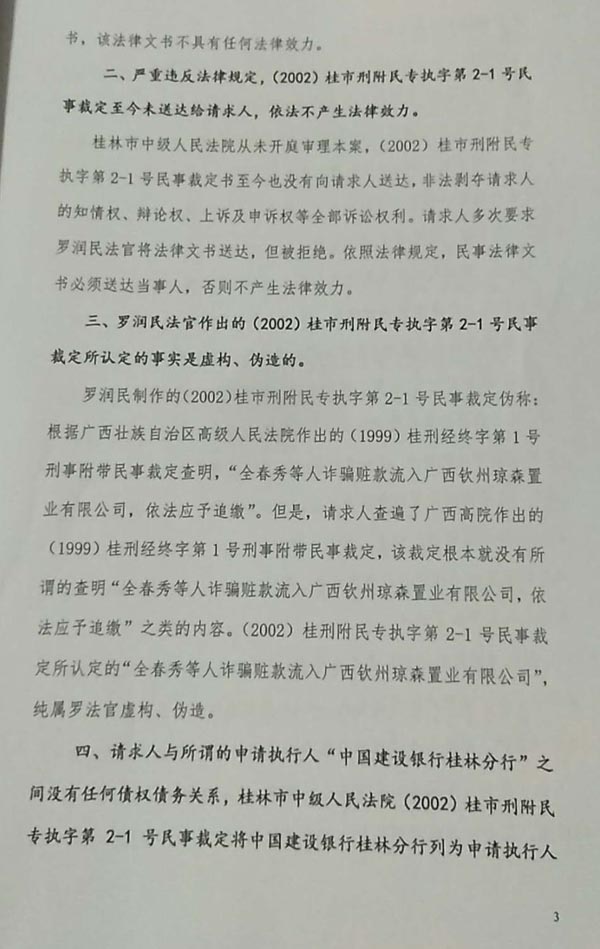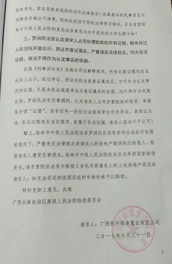 3、依法审查被控告人罗润民法官不顾最高人民法院发生法律效力的(2011)民提字第318号民事调解书效力,非法执行失去法律效力的自治区该院(2009)桂民再终字第6号民事判决书,给控告人珠海宝辉公司造成经济损失4.5亿元,罗润民应依法承担法律责任。