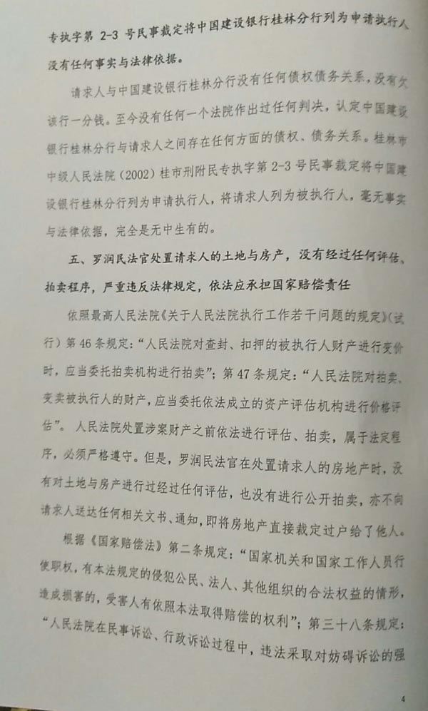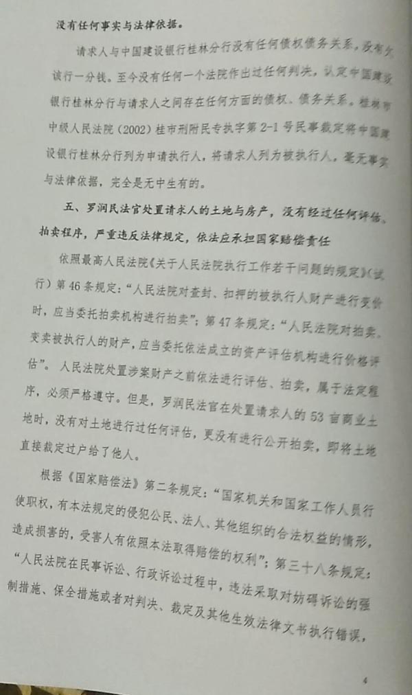 4、依法审查被控告人罗润民法官不顾三个案外人执行异议审理程序,把控告人三处资产曲解为不可分割物,故意违反法律规定于2017年4月12日拍卖超标查封2.55亿元资产,冲抵1亿元执行款项后,其他款项至今不知去向,给控告人一尺水公司造成3亿多元经济损失和企业瘫痪后果,罗润民应依法承担法律责任。