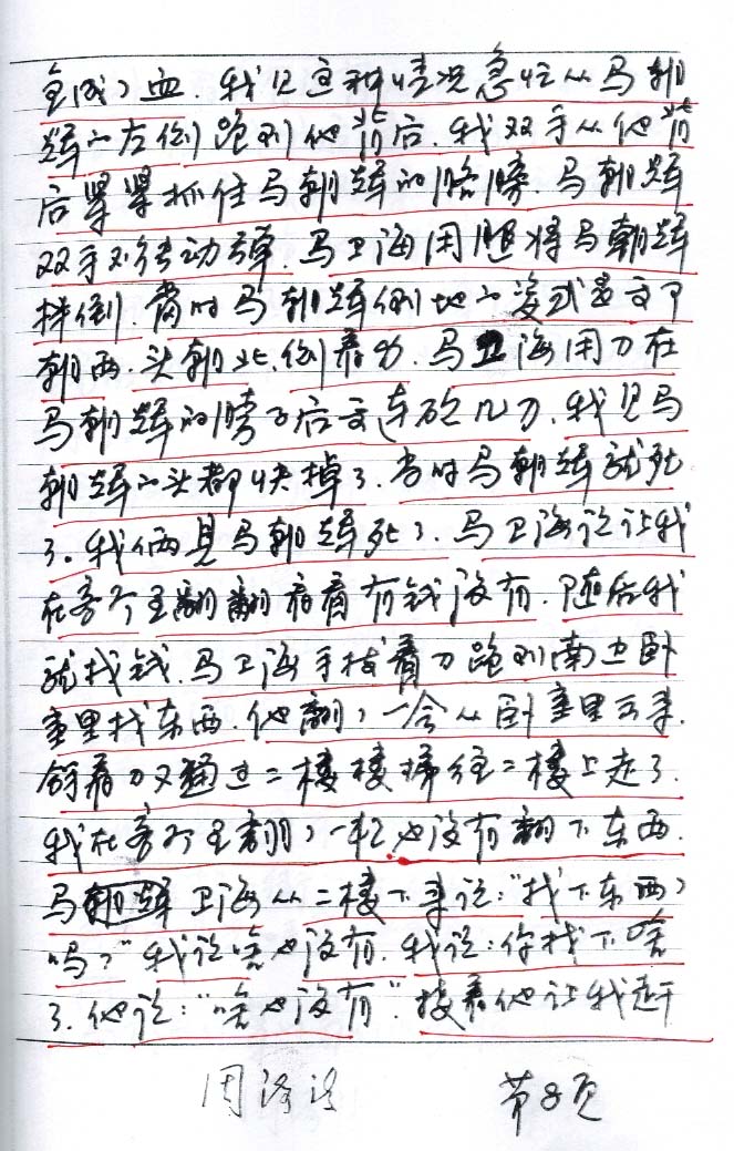李文浩2006年3月3日19时55分至2006年3月3日23时50分向公安机关供述“我从口袋里掏出刀来对着他的背部靠下部位捅了两刀,马朝晖哎哟了一声”(笔录第3页下端)。另供述,“拿刀在他的脖子上猛砍,直到脖子快被剁下,又在其会阴部扎了几刀”(笔录第4页中端)。