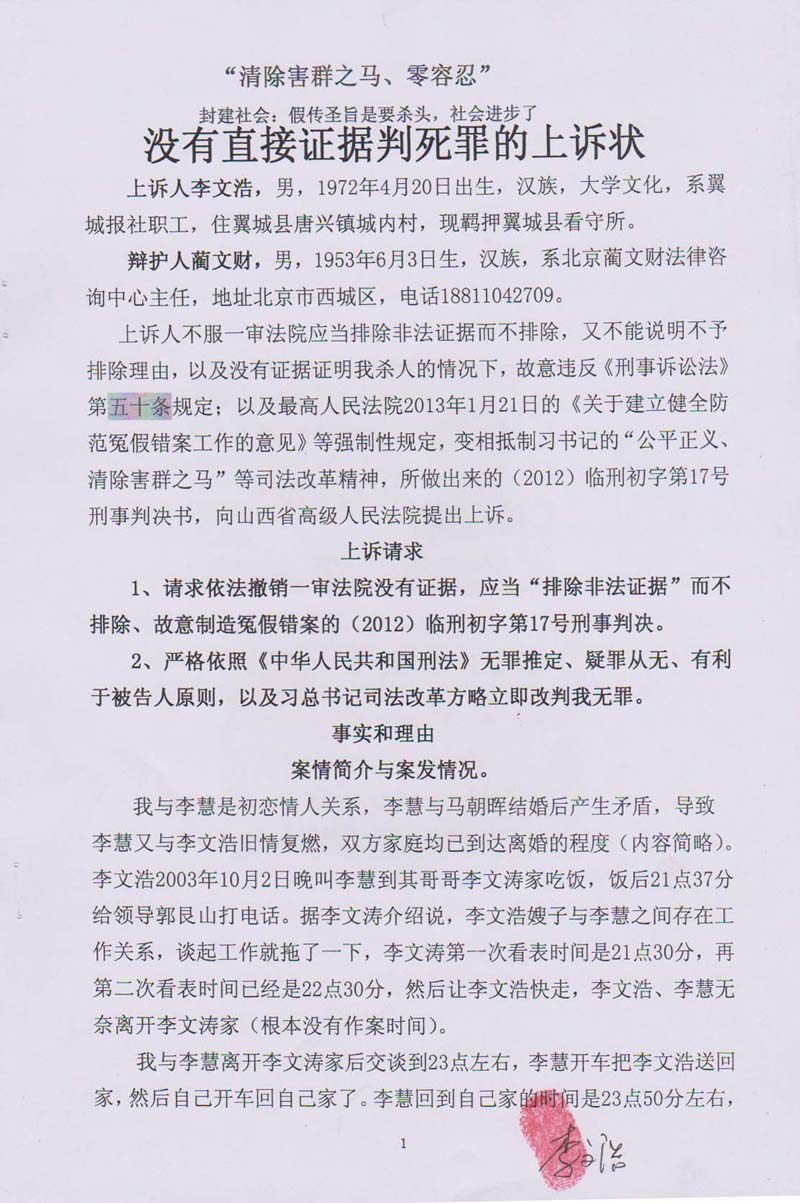 不要用 “多口供、零证据”判李文浩死刑,不要抗拒 习近平总书记、李克强总理司法改革治国方略。