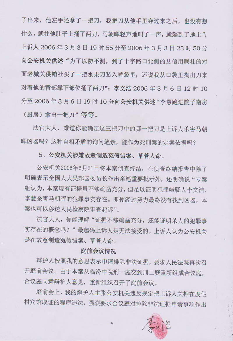 如果临汾市中级人民法院不使用这两份自相矛盾的口供,更是对没有一份值得考虑李文浩杀人的证据了,真是零证据,零证判李文浩死刑,严重违反《刑事诉讼法》第五十三条规定,对一切案件的判处都要重证据,重调查研究,不轻信口供。只有被告人供述,没有其他证据的,不能认定被告人有罪和处以刑罚;没有被告人供述,证据确实、充分的,可以认定被告人有罪和处以刑罚。