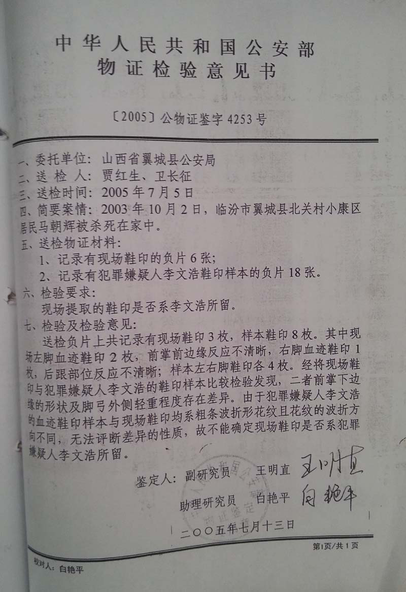 另外。本案还有另一个怪圈,以前临汾中院两次一审采信的是临汾市公安局鉴定,对杀人现场血脚印结论,认为血脚印是李文浩所留(唯一证据),规避了李文浩申请公安部的重新鉴定结论。