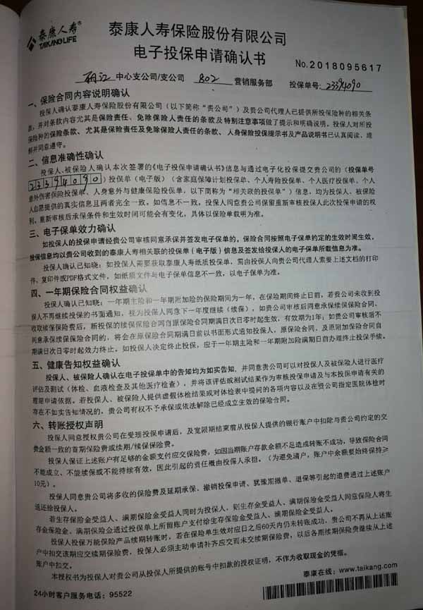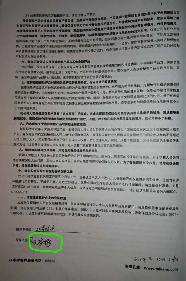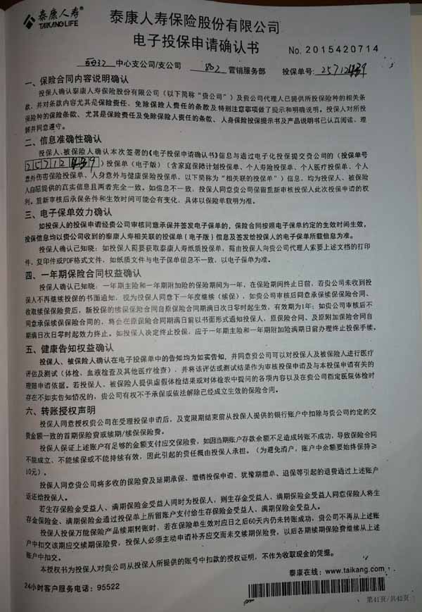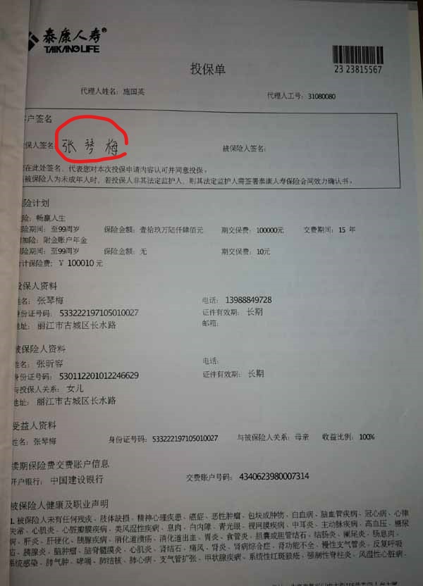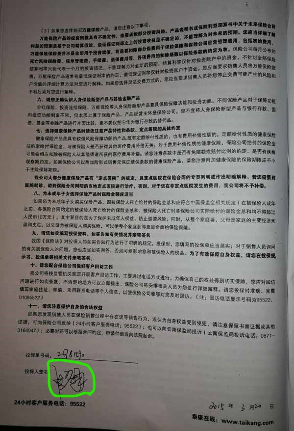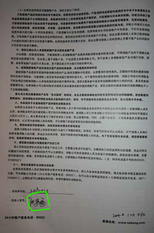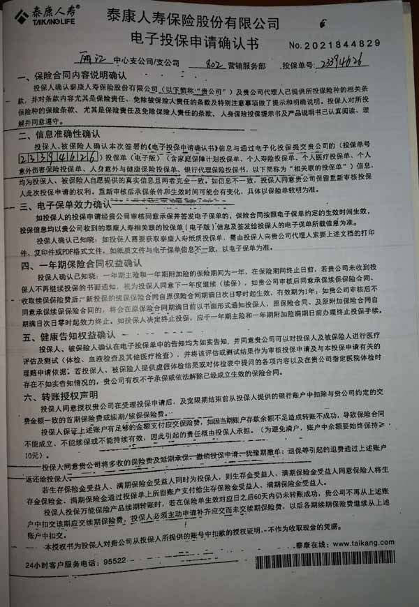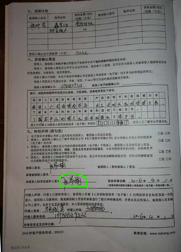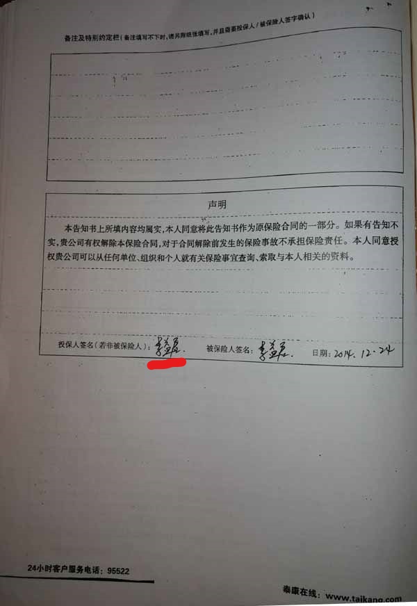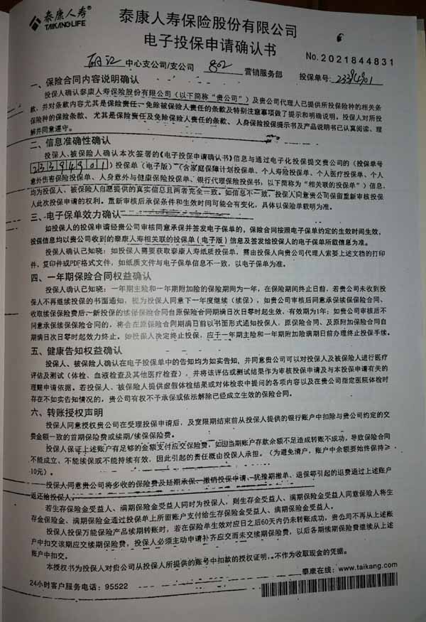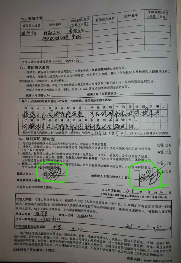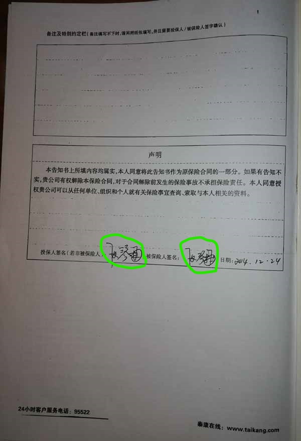 泰康人寿“保险合同虚假签名”案