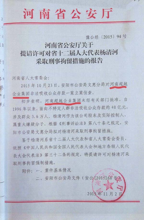 日以杨清河为“不具有独立法人主体资格的河南超越企业集团”的实际控制人理由,批准安阳警方对