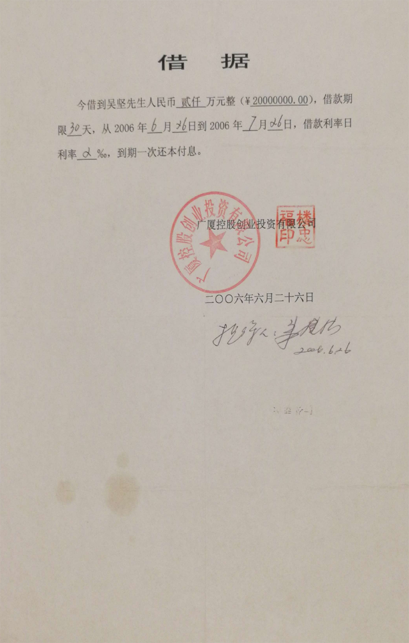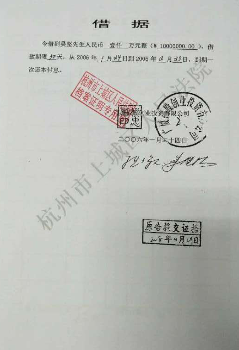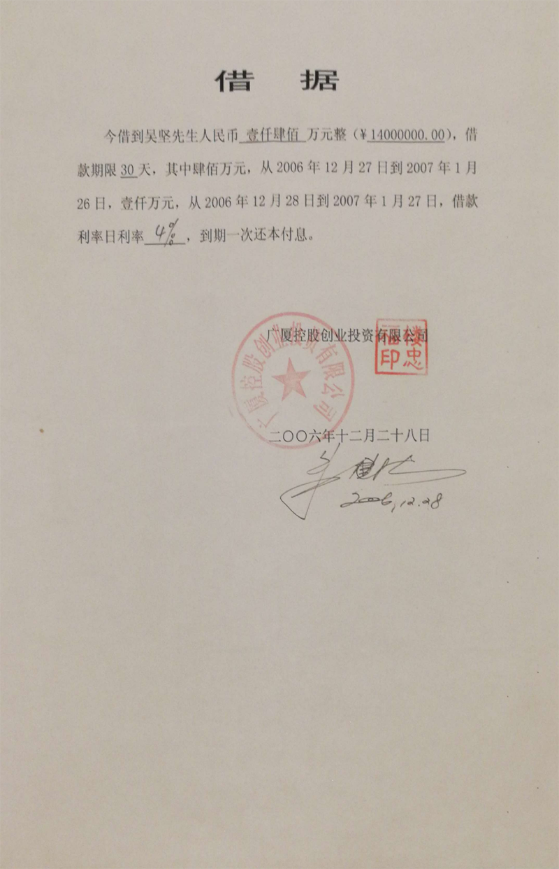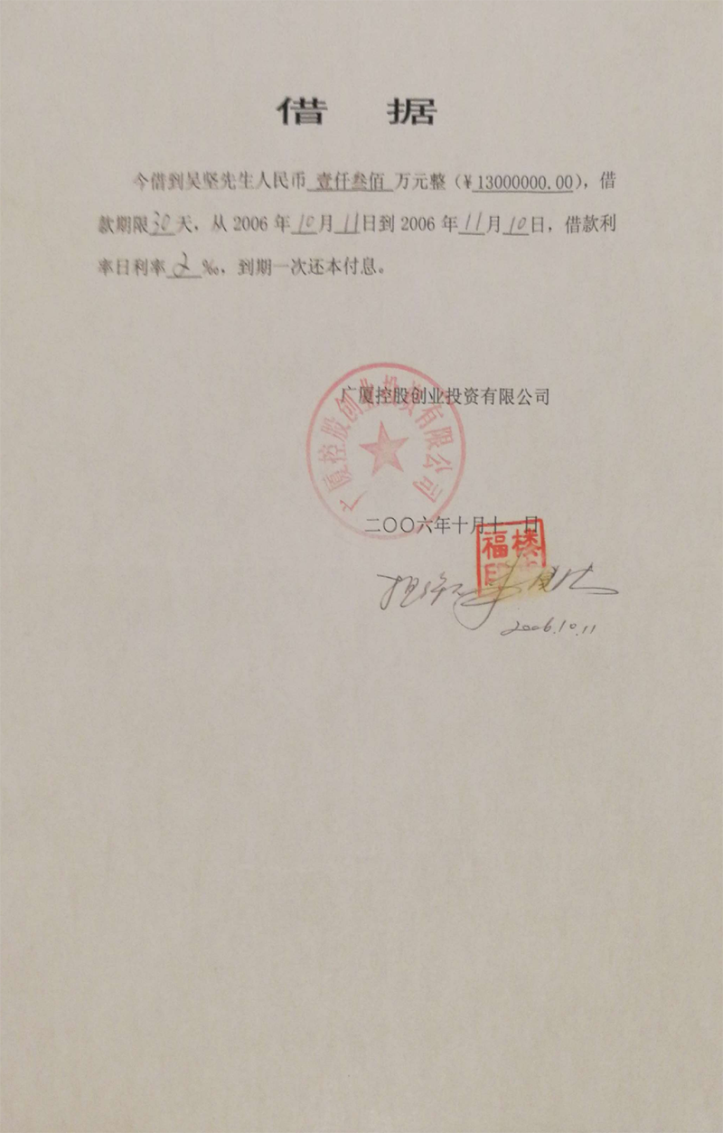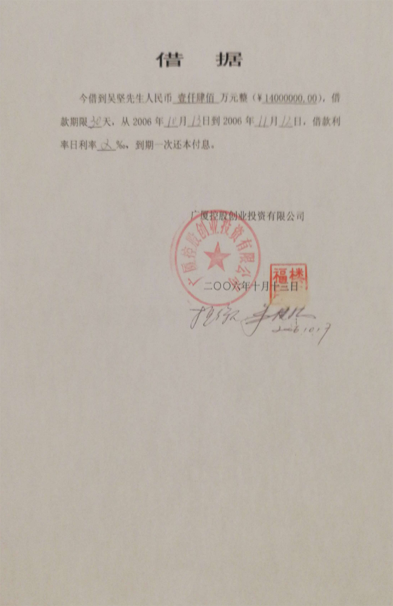 义乌商人吴坚曾向广厦集团出借60多笔款项(楼忠福已向法院确认63笔),他手握18笔盖着楼忠福名章的借据,将广厦集团告上法庭,请求法院判令广厦集团归还剩余18笔指向的2.59亿元本金。在吴坚向法庭出示金额本金2.59亿元的18张借据原件后,一审法院确认18张借据的有效性和款项2.59亿元数额。