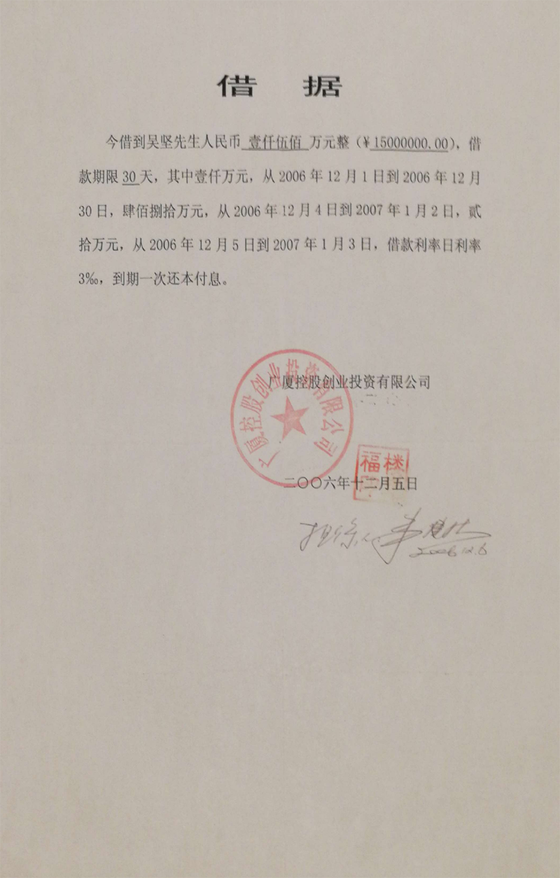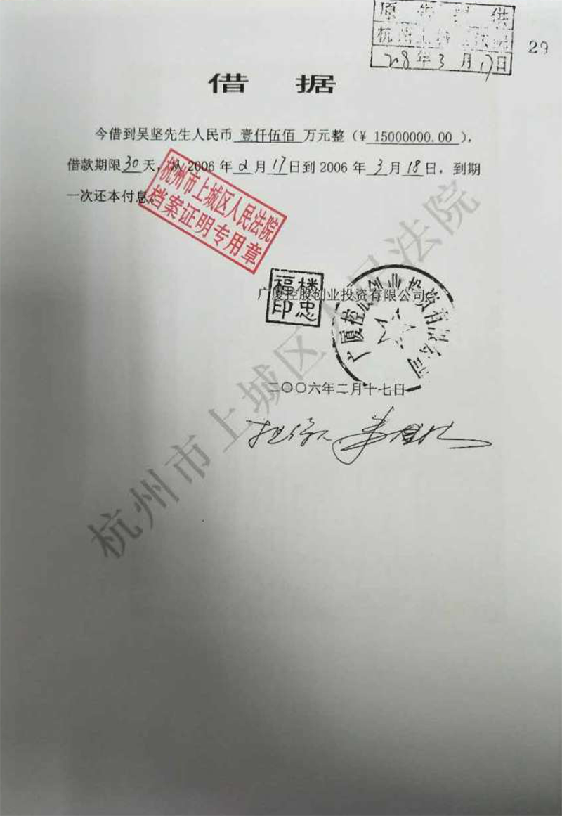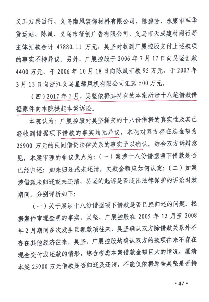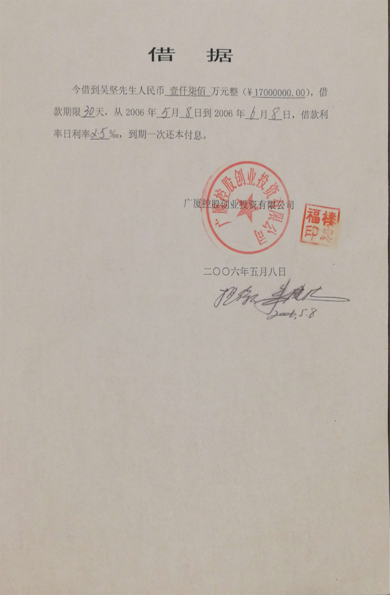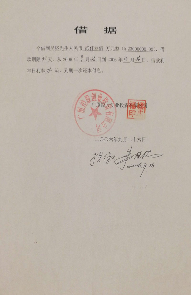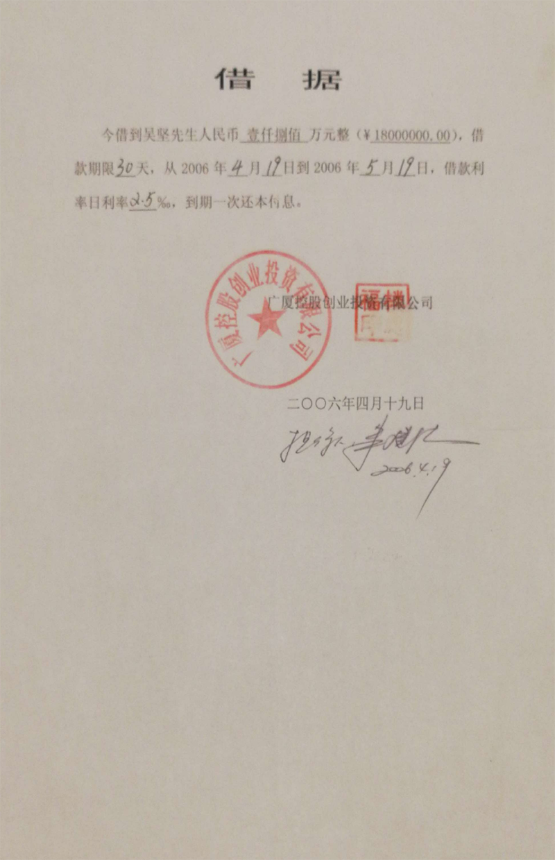 义乌商人吴坚曾向广厦集团出借60多笔款项(楼忠福已向法院确认63笔),他手握18笔盖着楼忠福名章的借据,将广厦集团告上法庭,请求法院判令广厦集团归还剩余18笔指向的2.59亿元本金。在吴坚向法庭出示金额本金2.59亿元的18张借据原件后,一审法院确认18张借据的有效性和款项2.59亿元数额。