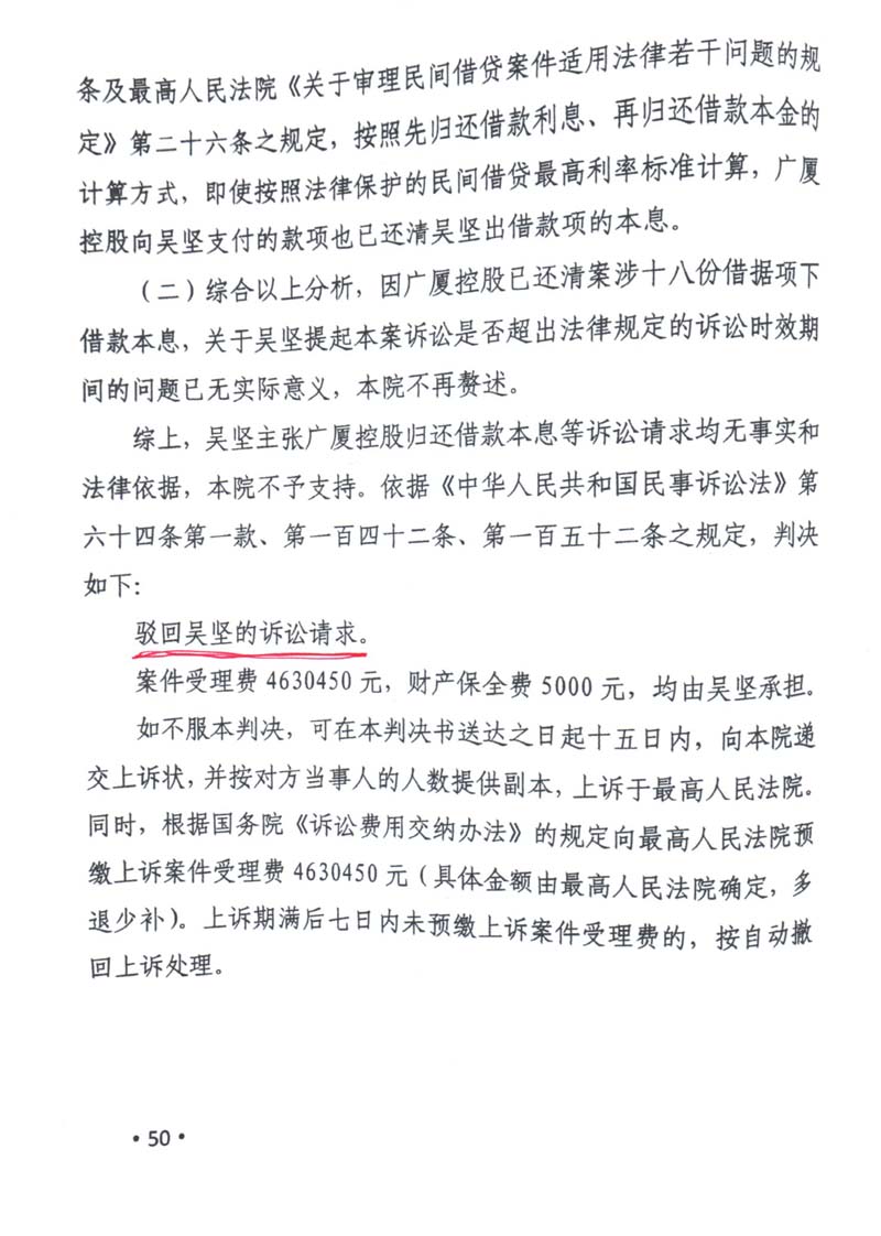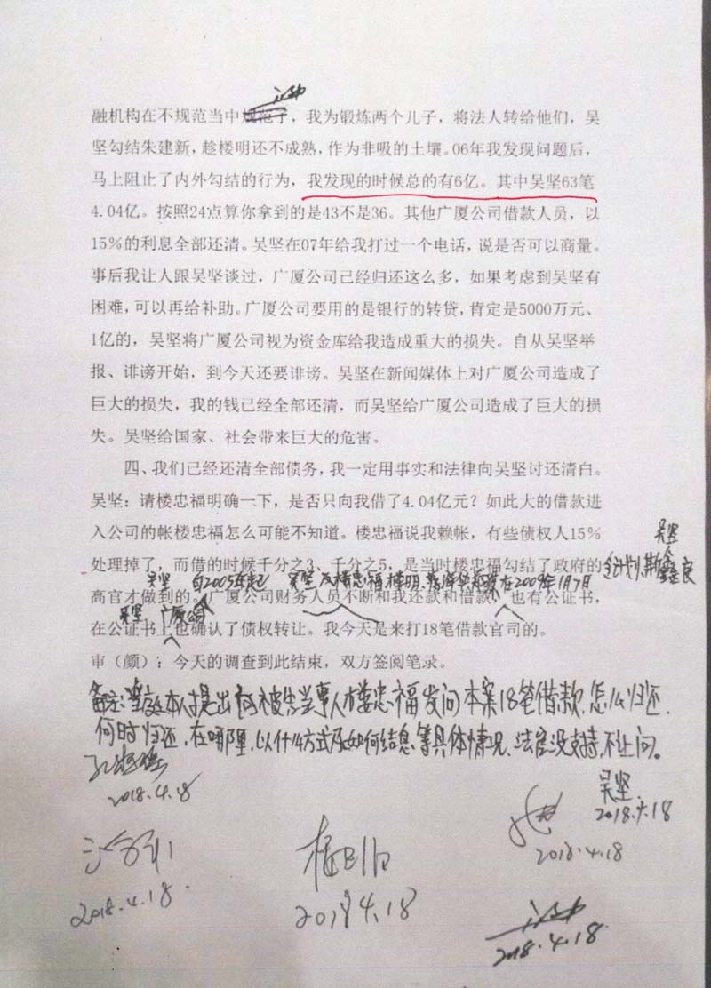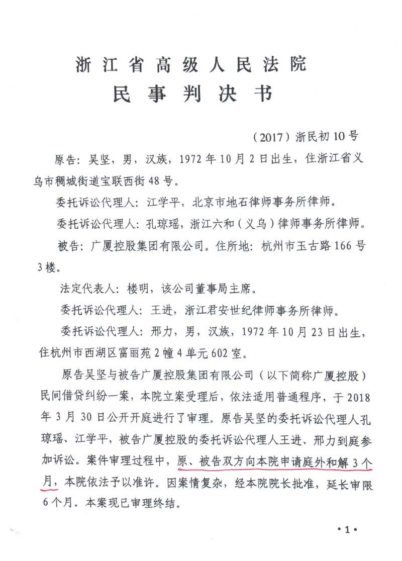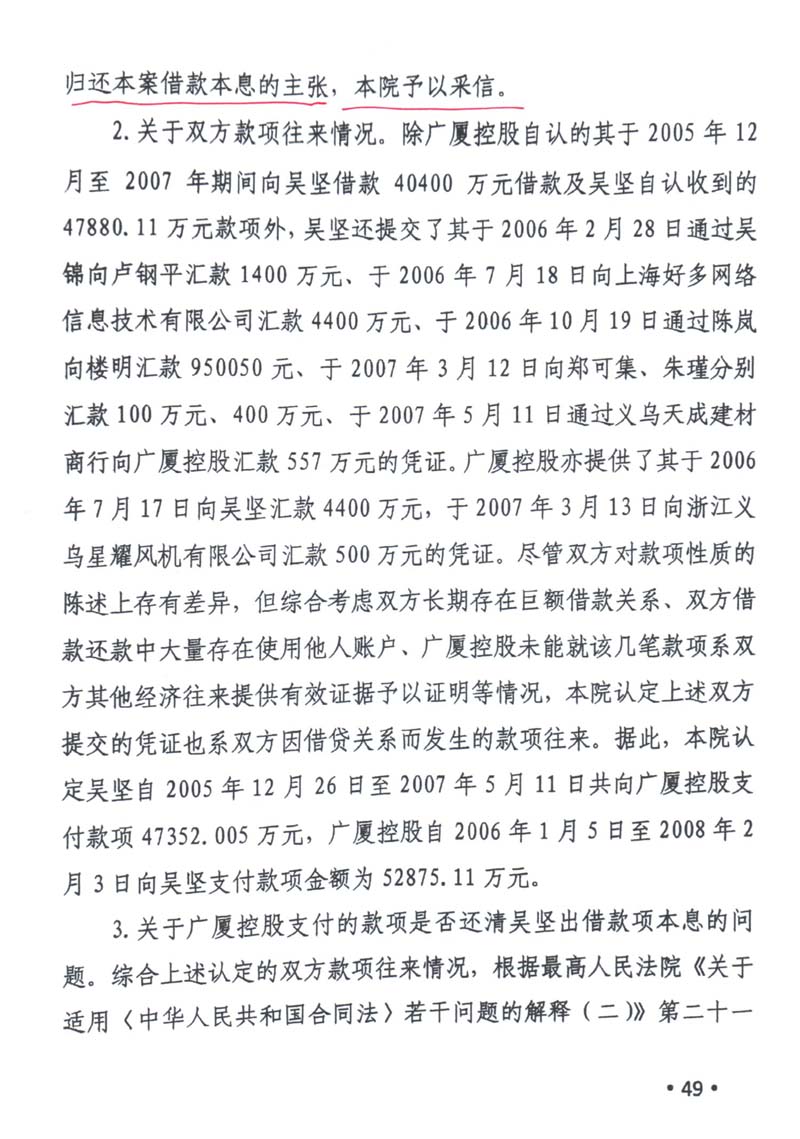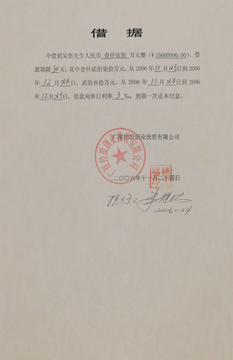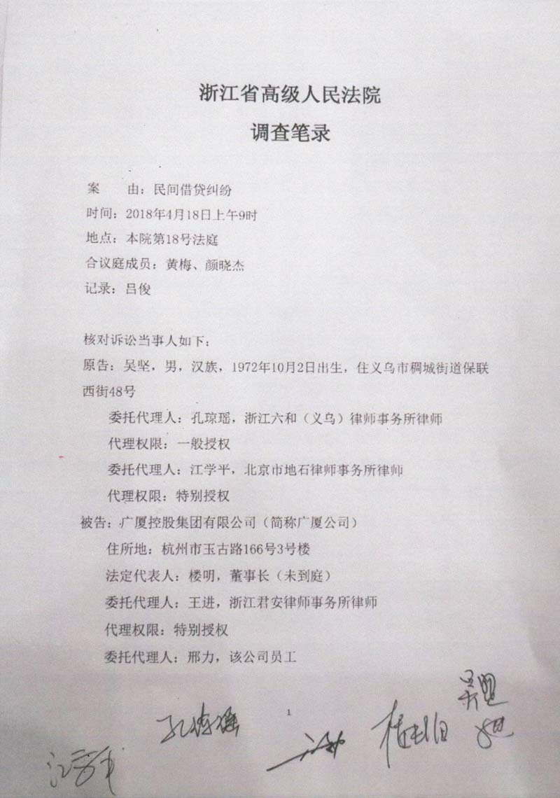 义乌商人吴坚曾向广厦集团出借60多笔款项(楼忠福已向法院确认63笔),他手握18笔盖着楼忠福名章的借据,将广厦集团告上法庭,请求法院判令广厦集团归还剩余18笔指向的2.59亿元本金。在吴坚向法庭出示金额本金2.59亿元的18张借据原件后,一审法院确认18张借据的有效性和款项2.59亿元数额。