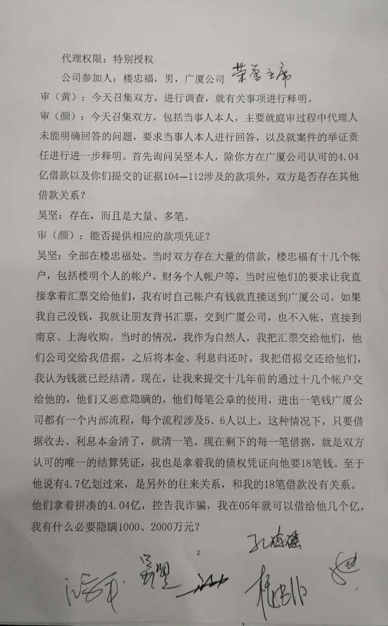 由于浙江省高级人民法院主管民庭的副院长徐建新与楼忠福有着特殊的关系,徐对此案进行了全程干预。一审合议庭在明知广厦集团出示完整账目就会真相大白的情况下,不要求广厦集团出示完整账目,故意做出违背事实真相的枉法裁判,帮助楼忠福或者广厦集团骗取吴坚本金2.59亿元,吴坚已实名举报。