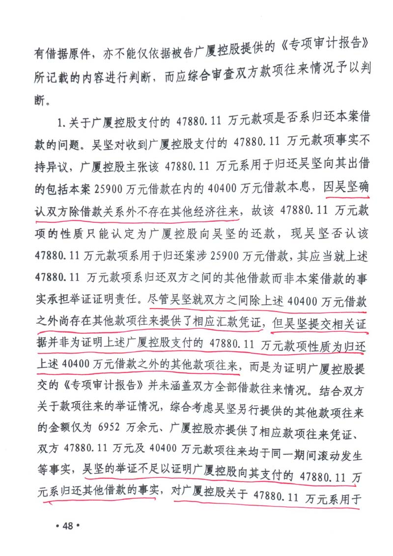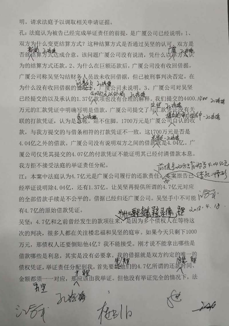 庭审中,广厦集团为对抗吴坚2.59亿元的债权请求,向法庭提供已归还给吴坚5.28亿元凭证,意图证明广厦集团已清偿2.59亿元的欠款本金。