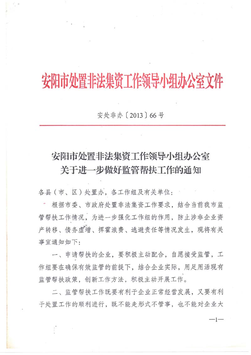 多元),2013年6月5日开始受安阳政府监管帮扶遭遇,并以安阳政府的《安除非办(2013)66号》