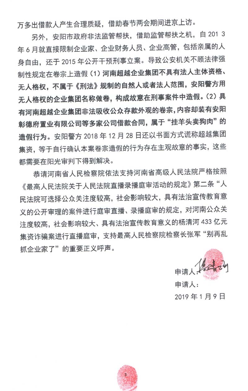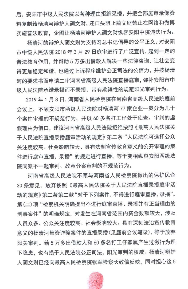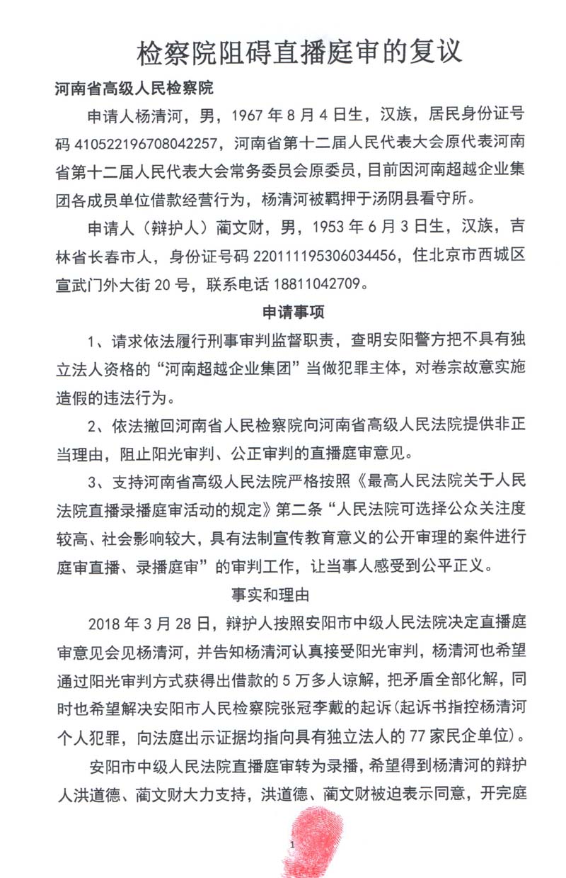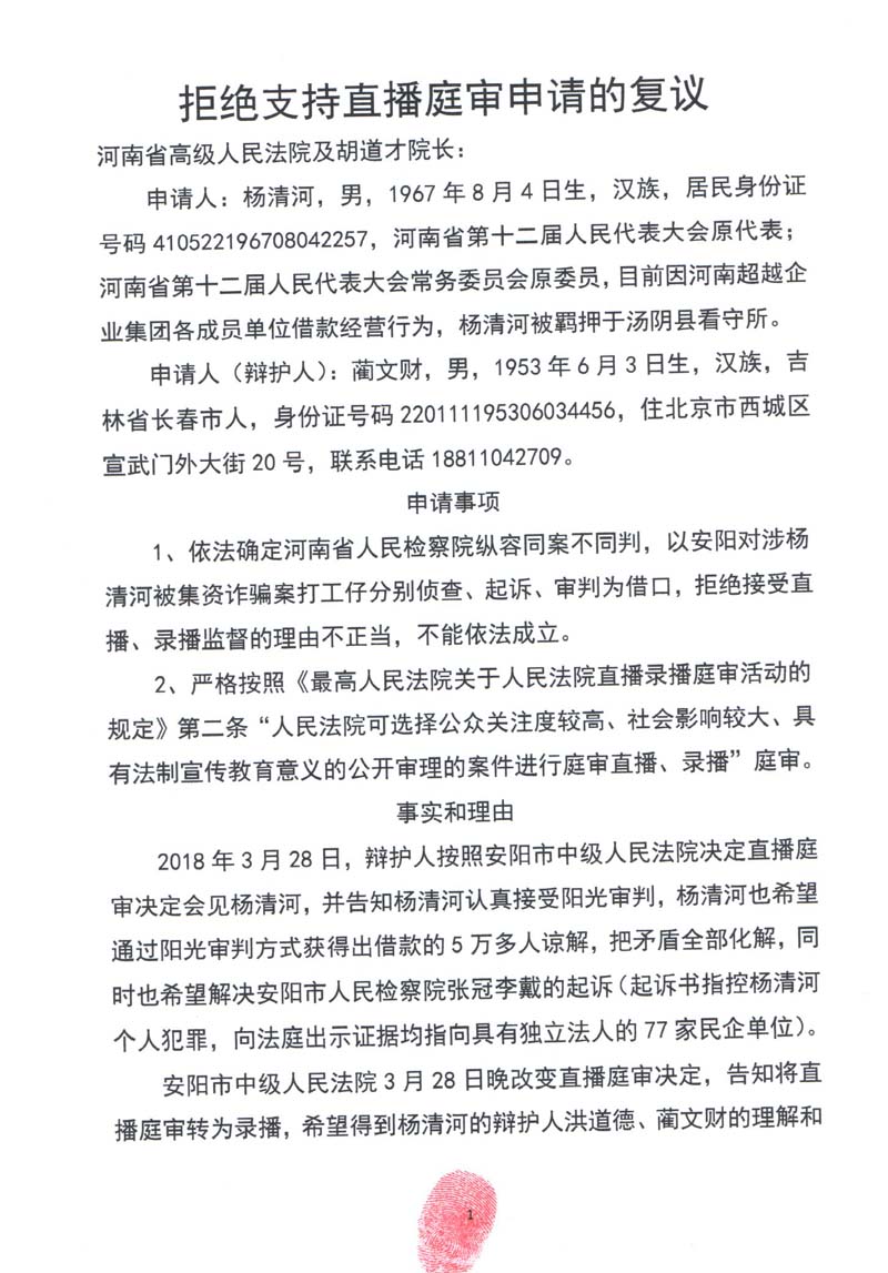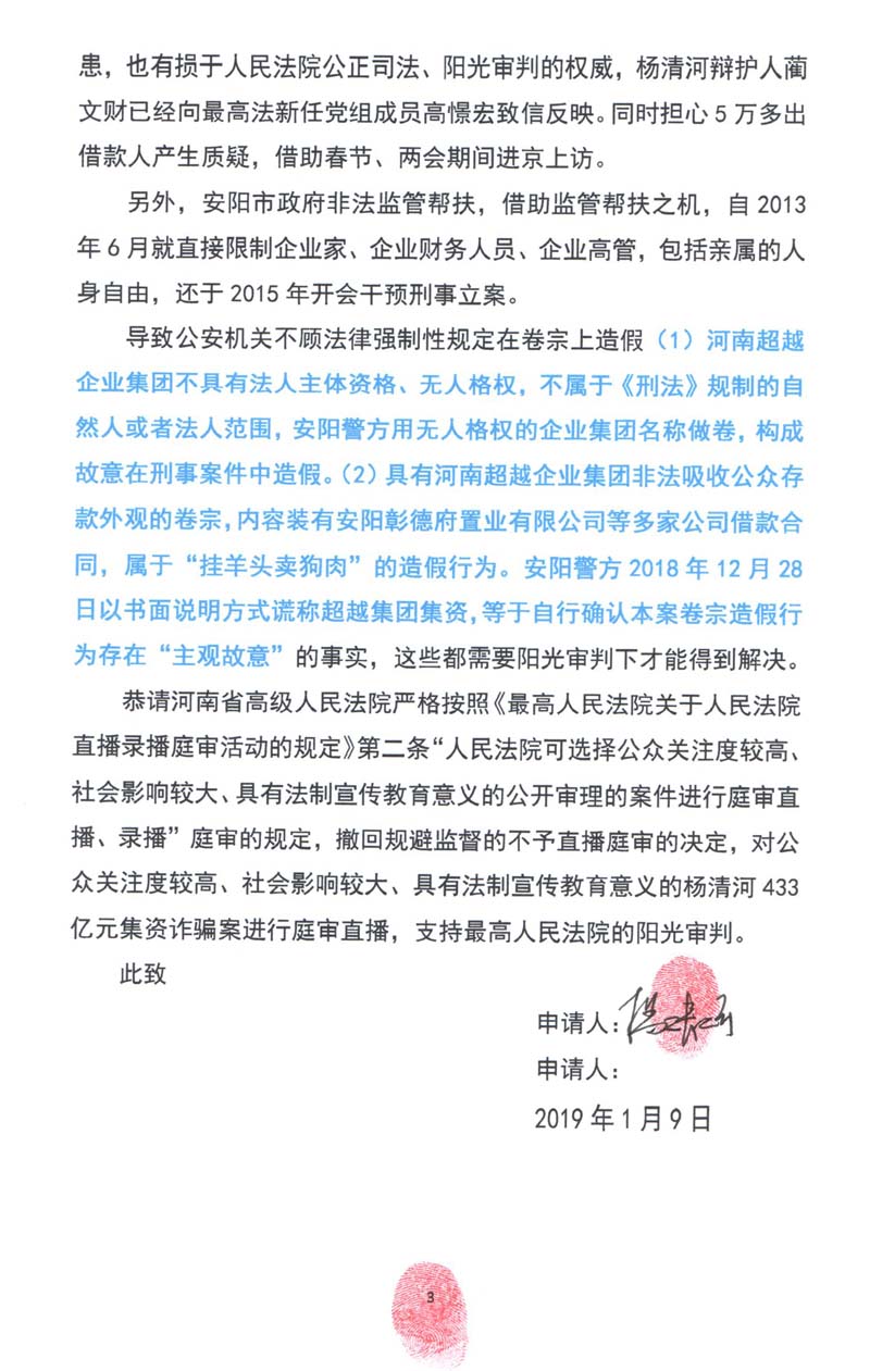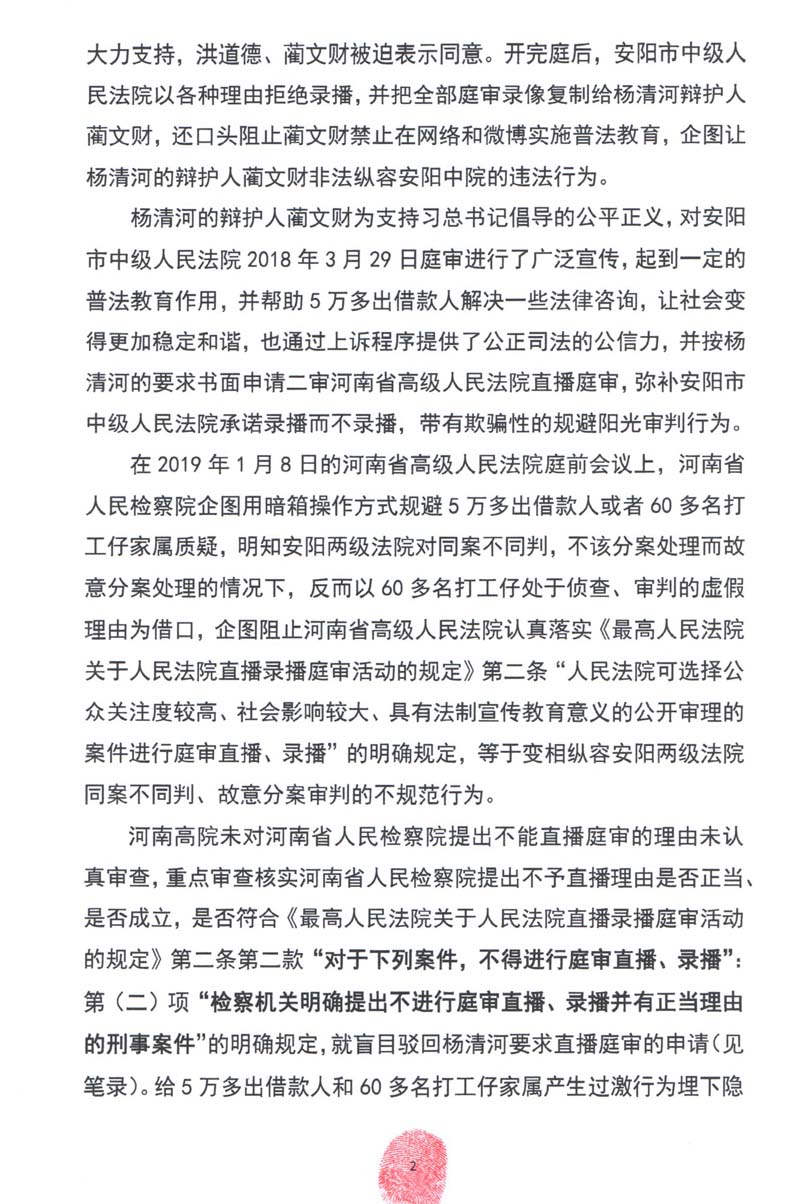 杨清河辩护人蔺文财结合安阳市中级人民法院决定庭审直播被欺骗的客观事实,以及最高人