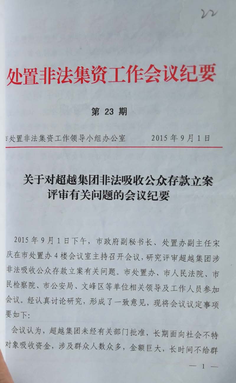 等企业家欠债不还的问题,2015年9月1日召开《关于对超越企业集团非法吸收公众存款立案评审有关问
