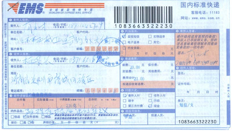 申请,并于2019年1月12日采用特快专递邮寄给两位领导(见两份书面复议申请和邮寄单据)。