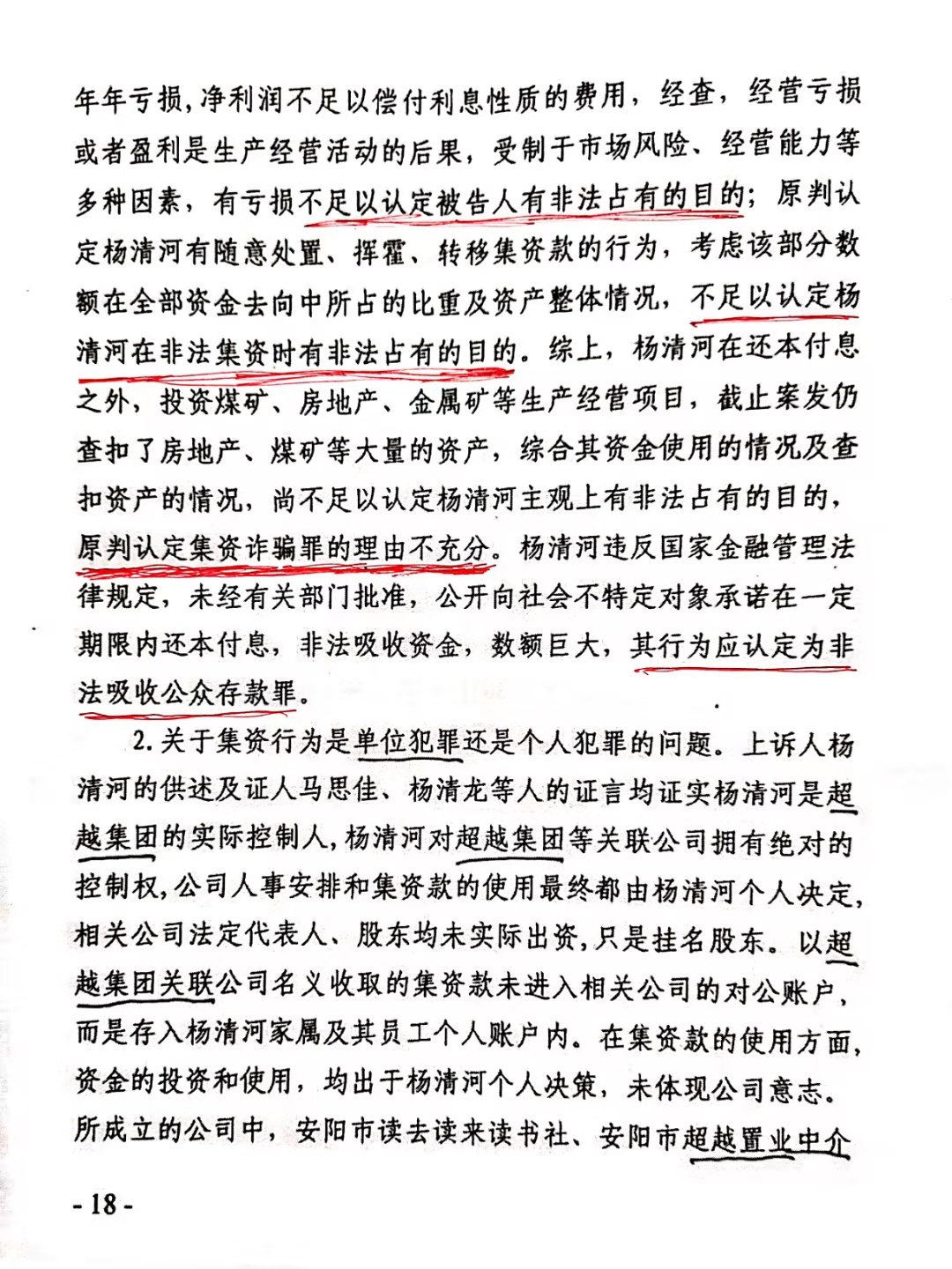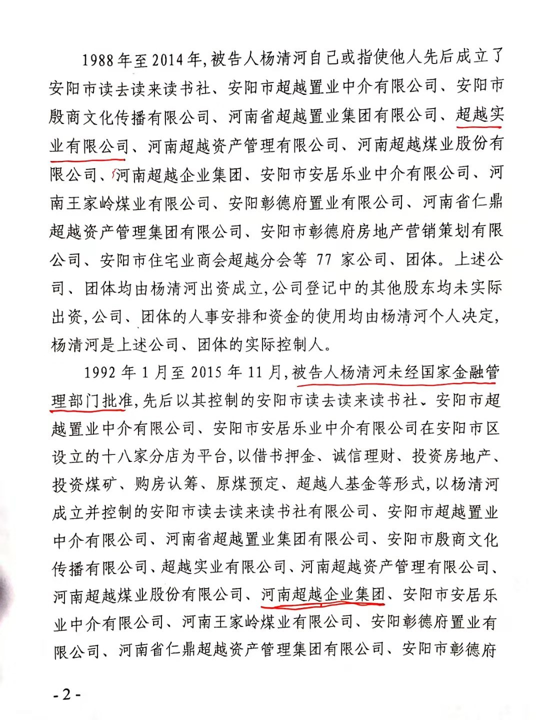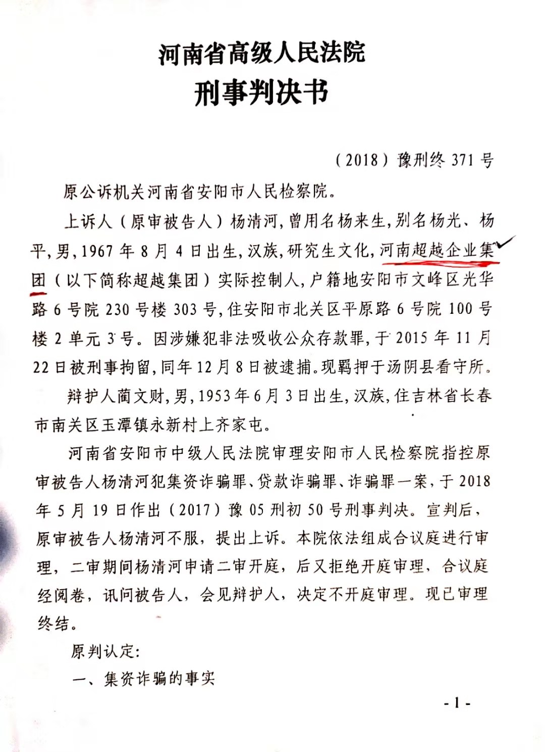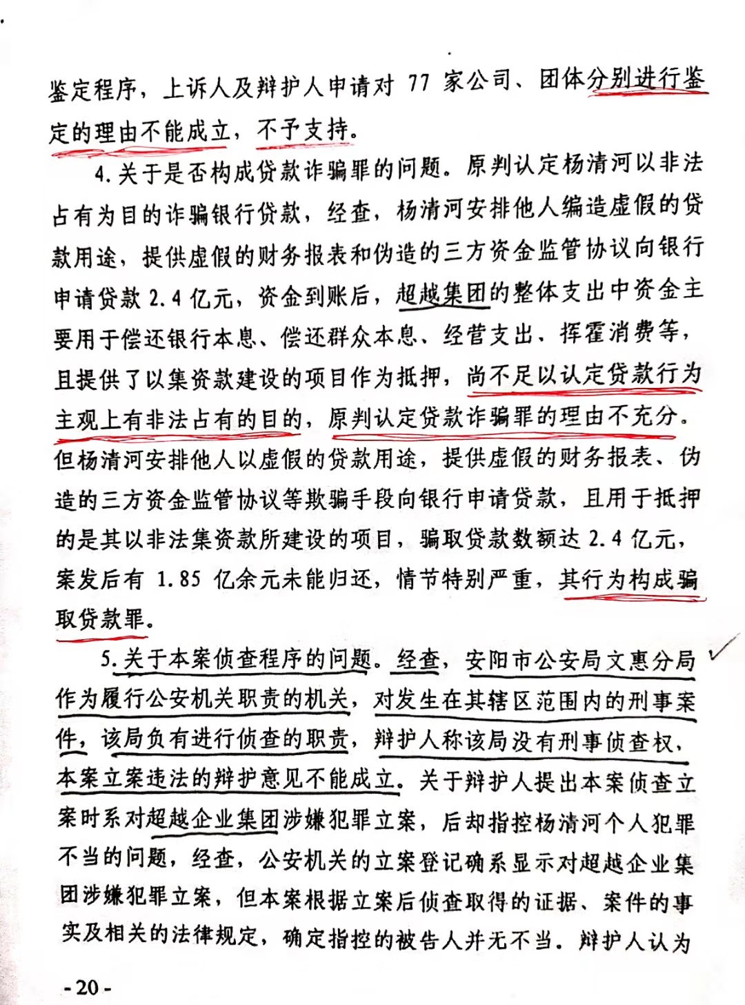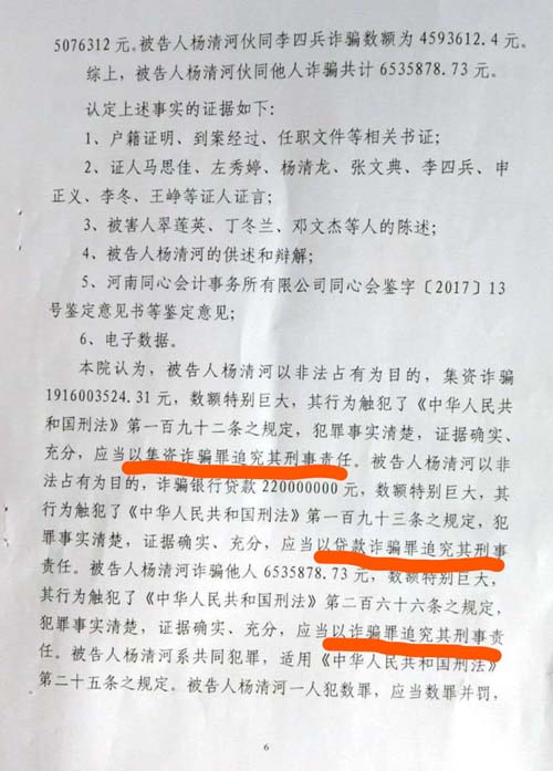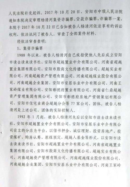 安阳市中级人民法院以(2017)豫05刑初50号一审刑事判决,判杨清河犯“集资诈骗罪,贷款诈骗罪”,支持了控方的部分起诉罪名。