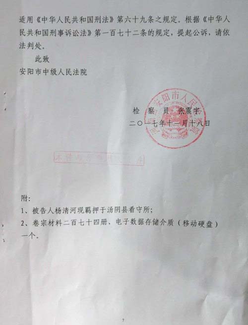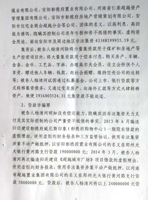 安阳市检察院以安检公诉刑诉(2017)7号起诉书,向安阳市中级人民法院指控杨清河犯“集资诈骗罪、贷款诈骗罪、诈骗罪”。