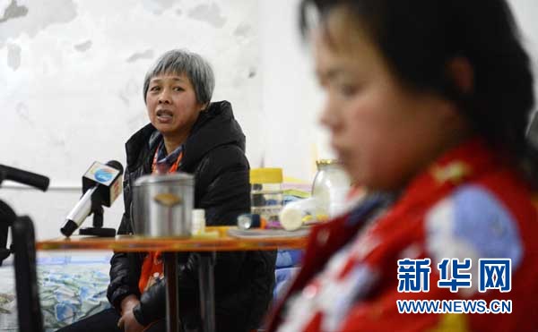 1月24日,陈庆霞的姐姐陈庆兰(左)在介绍事发经过。劳教、上访、拘留;截访、丢孩子、精神病;瘫痪、监视、太平间……日前,围绕着44岁的“上访户”陈庆霞的一系列关键词将公众目光迅速集中在黑龙江省伊春市带岭区。24日晚,新华社记者冒着风雪来到这个小城采访,对陈庆霞事件进行了采访。新华社记者王凯摄