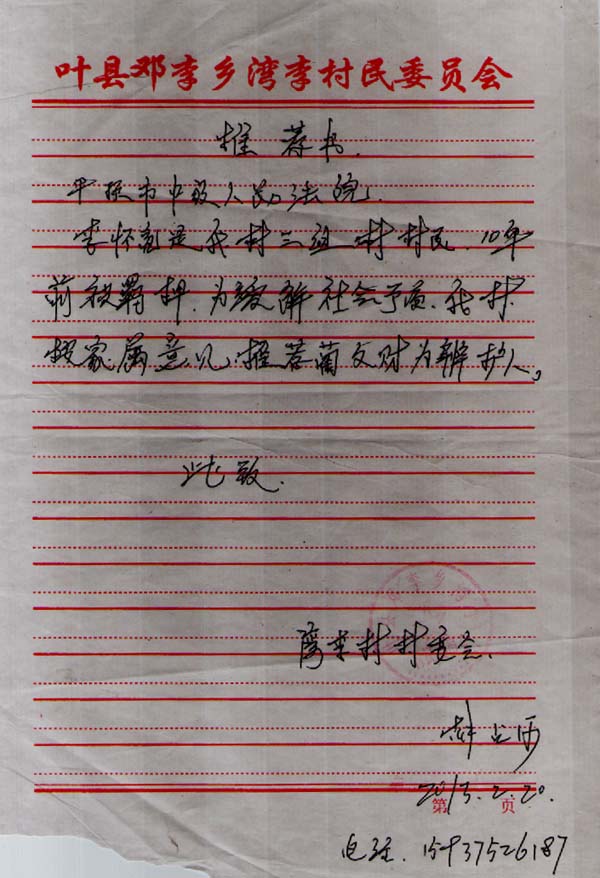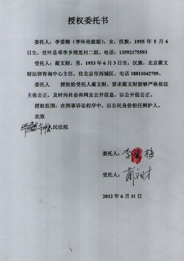 申请人李爱梅(死刑保证书受害人李怀亮姐姐),女,汉族,1955年5月6日生,住平顶山叶县邓李乡湾里村,电话1359217559。