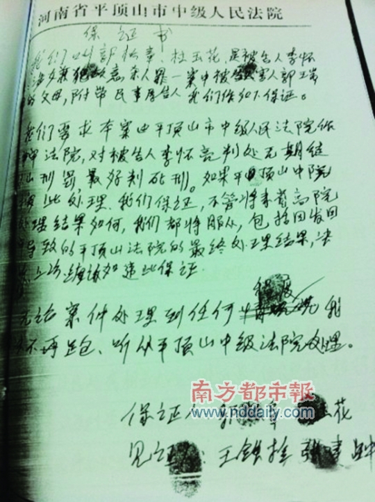 在接受有关记者采访时,受害人母亲杜玉花也回忆了当天写保证书的细节。杜说,当时接待她的平顶山中院一名法官要求她写保证书,“法官说,给你们提高审级,就不能再上访了。”杜说,她当时回应称,“你给我保证,判李怀亮死刑,给我闺女公平。”
