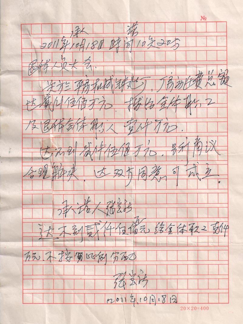 区政府于书记,希望你主持正义,希望把铸造厂的事处理好。张保庆一切材料全是假的,他自己也承认,在职职工补偿金已给完,剩下的我们就要求平分。