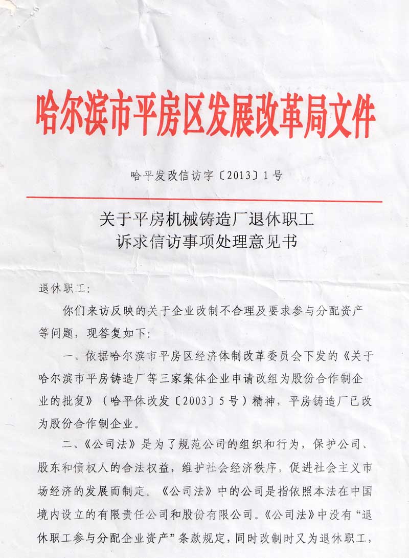 哈平发改,信访字2013年1号文件说得真好听挂羊头卖狗肉平房区政府发改委违法审批平方机械铸造厂虚假改制当年根本不存在在岗职工三十人在岗人数只有二十三人