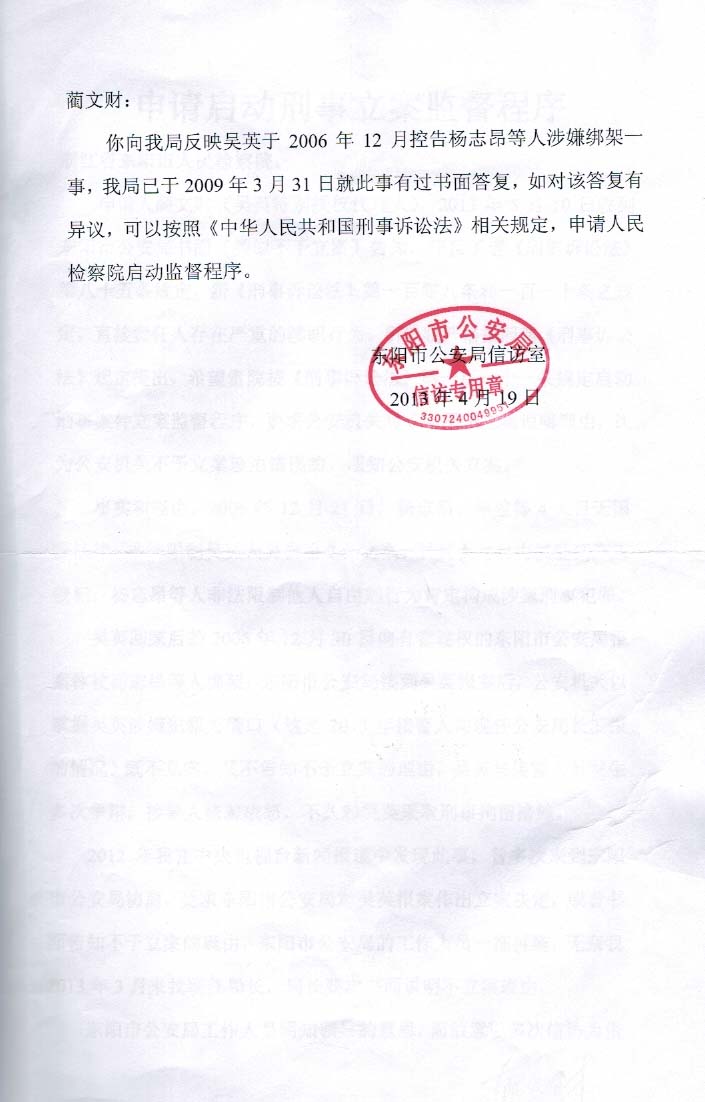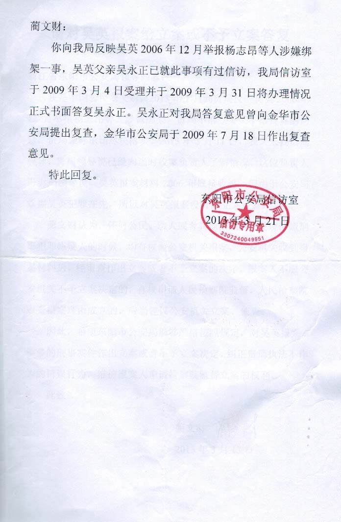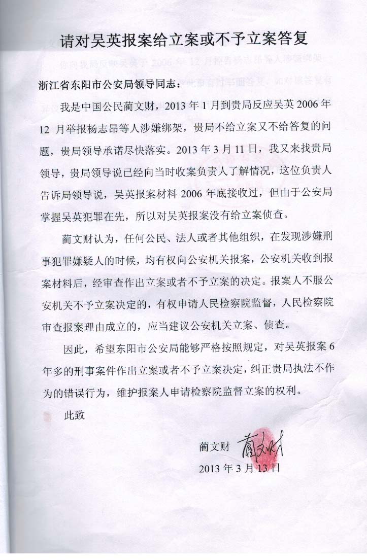 第一项、吴英举报被杨志昂绑架的进展情况。2006年12月21日,杨志昂等人开始限制吴英人身自由8天,吴英获得自由后收到三枚手枪子弹,立即向东阳市公安局报案,东阳市公安局接到吴英报案之后,至今没有做出立案或者不予立案决定,构成不作为。在蔺文财的督促下,东阳市公安局领导2013年3月口头告知,认为吴英报案前,公安机关已经掌握吴英涉嫌犯罪,不符合报案条件(见录像),所以没有立案侦查。蔺文财对不作为行为不服,要求东阳市公安局必须做出立案决定,或者书面说明不予立案的理由,维护当事人知情权(见书面材料)。东阳市公安局无奈,2013年4月19日作出书面告知(见告知书),告知申请人民检察院启动监督程序,目前检察院没有做出答复(见书面申请)。