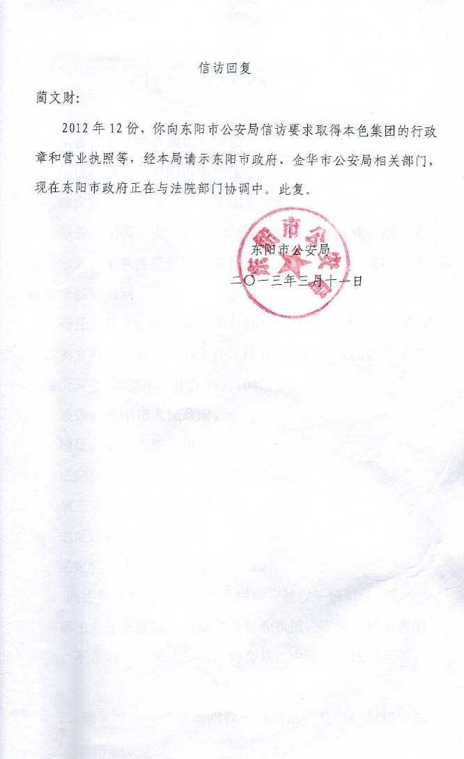 第五项、东阳市公安局拒不返还本色集团公章,导致本色集团对东阳市政府行政诉讼不能实现。金华中院说明上述情况后,蔺文财与吴英爸爸吴永正离开金华到东阳找公安局长,局长要求主管经侦的副局长接待,仍然坚持请示东阳市政府后才能返还公章和企业营业执照(行政许可),蔺文财无奈,只好返回北京,耐心等待东阳市公安局请示东阳市政府允许返还营业执照和公章的结果,至今无消息。