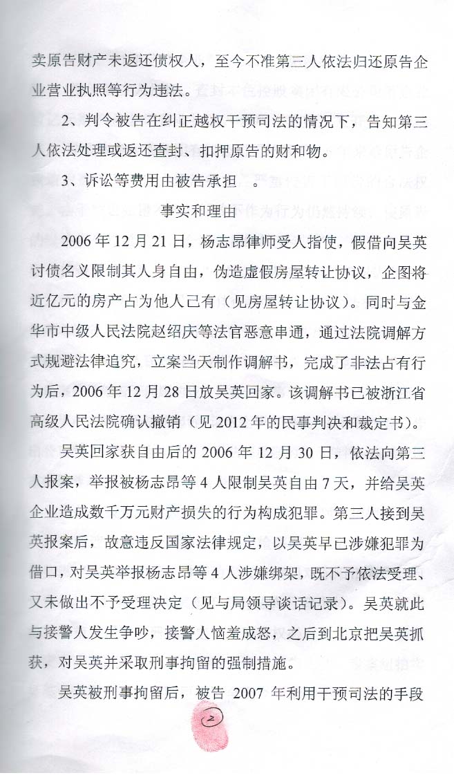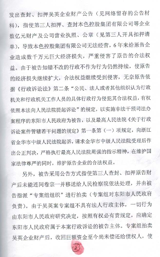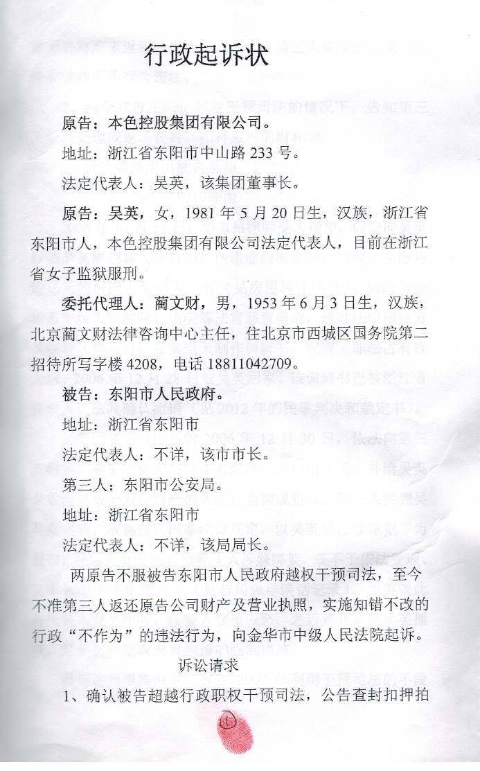 我是吴英举报被杨志昂绑架未获东阳市公安局受理;东阳市政府公告、扣押本色集团财产不予处理;东阳市公安局查封、扣押本色集团营业执照、公章不予返还,无奈提起行政诉讼(民告官)代理人蔺文财,现把案件经过和进展简单汇报一下,征求著名法律专家和知名律师意见。