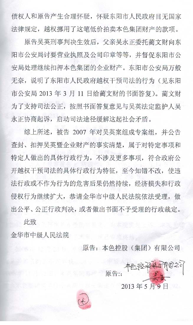第四项、吴英对政府不作为行为起诉。吴英想处理财产偿还债务未果,以东阳市政府为被告,按照行政案件管辖规定向金华市中院提起诉讼,金华市中院收到起诉书审查认为本色集团企业没有被注销,具备行政诉讼原告主体资格,有能力提起行政诉讼,不具备法定代表人起诉条件,应当加盖本色集团公章进行诉讼,人民法院应当审查立案。