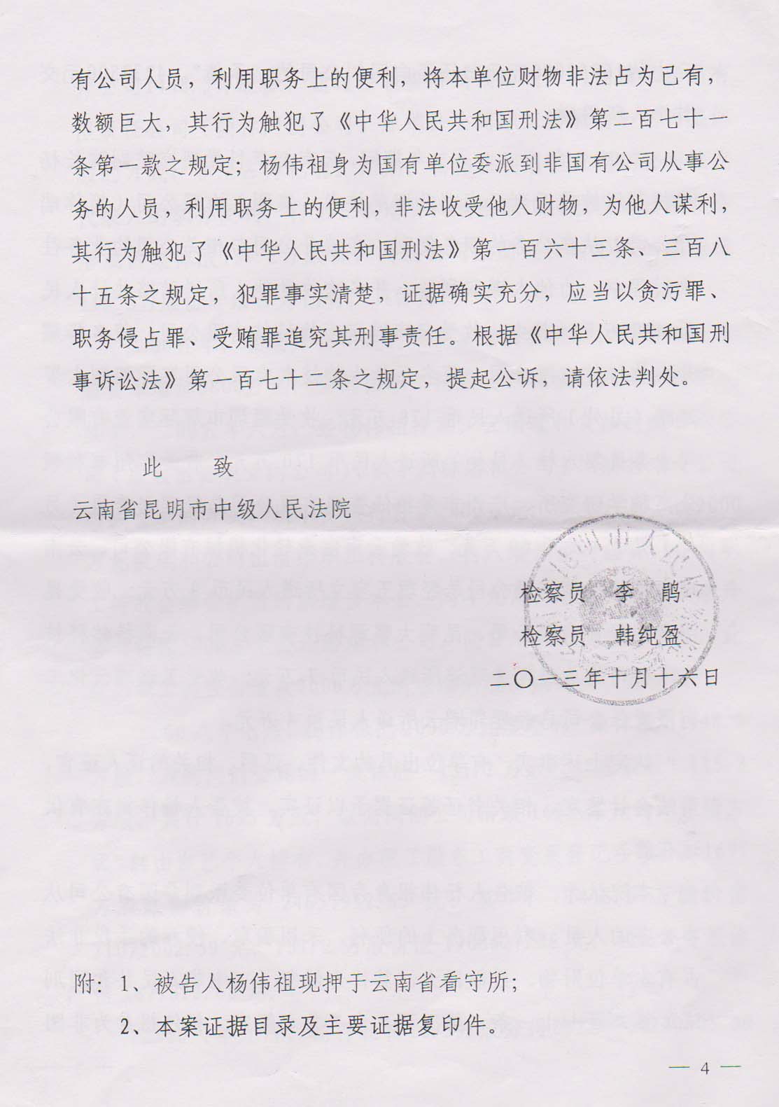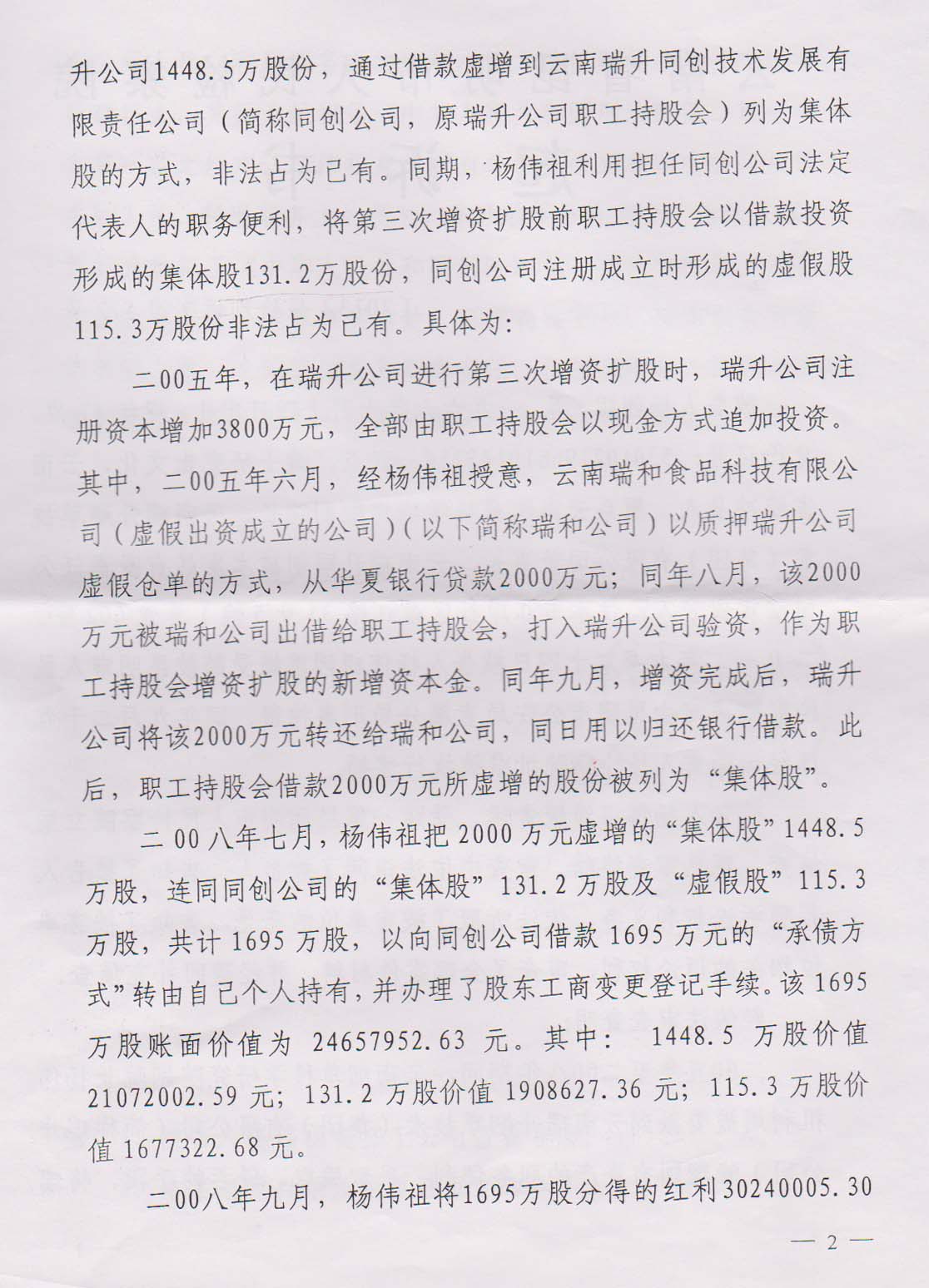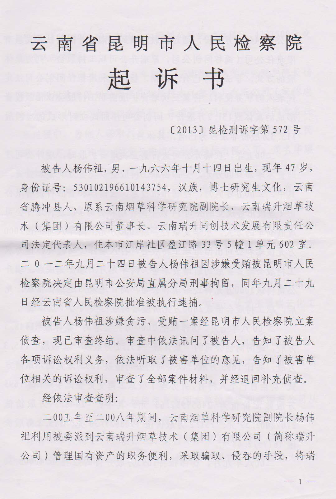 另有证据证明云南烟草科学研究院2004年改派一把手陈辉敏等三人到云南瑞升烟草技术集团有限公司工作,但云南瑞升烟草技术(集团)有限责任公司没有改变杨伟祖的法定代表人职务,不属于云南烟草科学研究院的安排,他不相信是国家机关、企业工作人员。2012年9月24日被昆明市人民检察院刑事拘留;云南省人民检察院9月29日批准逮捕;现已进入审判程序。600职工的有限责任公司,以及数亿元企业资产的发展何去何从。
